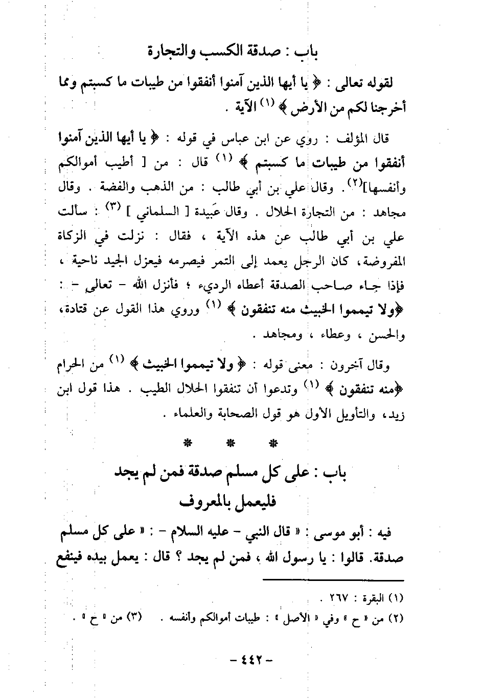 لِقَوْلِهِ تَعَالَى: (يَا أَيُّهَا الَّذِينَ آمَنُوا أَنْفِقُوا مِنْ طَيِّبَاتِ مَا كَسَبْتُمْ وَمِمَّا أَخْرَجْنَا لَكُمْ مِنَ الأرْضِ (الآية [البقرة: 267] . قال المؤلف: روى عن ابن عباس فى قوله: (يا أيها الذين آمنوا أنفقوا من طيبات ما كسبتم (قال: من أطيب أموالكم وأنفسها. وقال على بن أبى طالب: من الذهب والفضة. وقال مجاهد: من التجارة الحلال. وقال عبيدة السلمانى: سألت على بن أبى طالب عن هذه الآية، فقال: نزلت فى الزكاة المفروضة، كان الرجل يعمد إلى التمر فيصرمه فيعزل الجيد ناحية، فإذا جاء صاحب الصدقة أعطاه الردئ، فأنزل الله تعالى: (ولا تيمموا الخبيث منه تنفقون) [البقرة: 267] وروى هذا القول عن قتادة، والحسن، وعطاء، ومجاهد. وقال آخرون: معنى قوله: (ولا تيمموا الخبيث (من الحرام) منه تنفقون (وتدعوا أن تنفقوا الحلال الطيب. هذا قول ابن زيد، والتأويل هو قول الصحابة والعلماء.