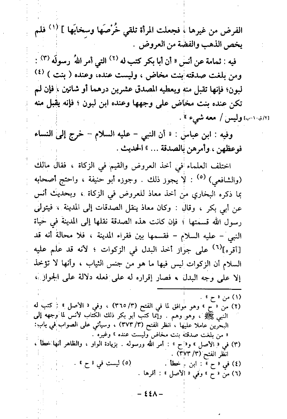 الْفَرْضِ مِنْ غَيْرِهَا، فَجَعَلَتِ الْمَرْأَةُ تُلْقِى خُرْصَهَا وَسِخَابَهَا، فَلَمْ يَخُصَّ الذَّهَبَ وَالْفِضَّةَ مِنَ الْعُرُوضِ. / 41 - فيه: ثُمَامَةُ، عن أَنَس، أَنَّ أَبَا بَكْرٍ كَتَبَ لَهُ الَّتِى أَمَرَ اللَّهُ رَسُولَهُ (صلى الله عليه وسلم) : (وَمَنْ بَلَغَتْ صَدَقَتُهُ بِنْتَ مَخَاضٍ وَلَيْسَتْ عِنْدَهُ، وَعِنْدَهُ بِنْتُ لَبُونٍ، فَإِنَّهَا تُقْبَلُ مِنْهُ، وَيُعْطِيهِ الْمُصَدِّقُ عِشْرِينَ دِرْهَمًا أَوْ شَاتَيْنِ، فَإِنْ لَمْ يَكُنْ عِنْدَهُ بِنْتُ مَخَاضٍ عَلَى وَجْهِهَا، وَعِنْدَهُ ابْنُ لَبُونٍ، فَإِنَّهُ يُقْبَلُ مِنْهُ، وَلَيْسَ مَعَهُ شَىْءٌ) . / 42 - وفيه: ابْن عَبَّاس، أن النّبِىّ، (صلى الله عليه وسلم) ، خرج إِلى النِّسَاءَ، فَوَعَظَهُنَّ، وَأَمَرَهُنَّ بالصدقة. . . . .) الحديث. اختلف العلماء فى أخذ العروض والقيم فى الزكاة، فقال مالك والشافعى: لا يجوز ذلك. وجوزه أبو حنيفة، واحتج أصحابه بما ذكر البخارى من أخذ معاذ للعروض فى الزكاة، وبحديث أنس عن أبى بكر، وقال: وكان معاذ ينقل الصدقات إلى المدينة، فيتولى رسول الله قسمتها، فإن كانت هذه الصدقة نقلها إلى المدينة فى حياة النبى، (صلى الله عليه وسلم) ، فقسمها بين فقراء المدينة، فلا محالة أنه قد أقره على جواز أخذ البدل فى الزكوات، لأنه قد علم (صلى الله عليه وسلم) أن الزكوات ليس فيها ما هو من جنس الثياب، وأنها لا تؤخذ إلا على وجه البدل، فصار إقراره له على فعله دلالة على الجواز،