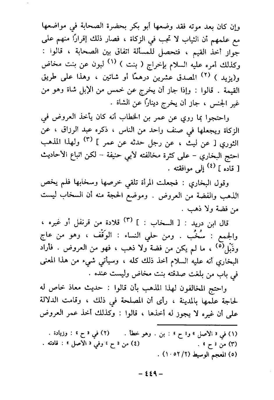 وإن كان بعد موته فقد وضعها أبو بكر بحضرة الصحابة فى مواضعها مع علمهم أن الثياب لا تجب فى الزكاة، فصار ذلك إقرارًا منهم على جواز أخذ القيم، فتحصل للمسألة اتفاق بين الصحابة، قالوا: وكذلك أمره (صلى الله عليه وسلم) بإخراج بنت لبون، عن بنت مخاض، ويزيد المصدق عشرين درهمًا أو شاتين، وهذا على طريق القيمة، قالوا: وإذا جاز أن يخرج عن خمس من الإبل شاة وهو من غير الجنس، جاز أن يخرج دينارًا عن الشاة. واحتجوا بما روى عن عمر بن الخطاب، أنه كان يأخذ العروض فى الزكاة ويجعلها فى صنف واحد من الناس، ذكره عبد الرزاق، عن الثورى، عن ليث، عن رجل حدثه عن عمر، ولهذا المذهب احتج البخارى، على كثرة مخالفته لأبى حنيفة، لكن اتباع الأحاديث قاده إلى موافقته. وقول البخارى: فجعلت المرأة تلقى خرصها وسخابها فلم يخص الذهب والفضة من العروض. وموضع الحجة منه أن السخاب ليست من فضة ولا ذهب. قال ابن دريد: السخاب: قلادة من قرنفل أو غيره، والجمع: سُخُب. ومن حلى النساء: الوَقْف، وهو من عاج وذَبْل، ما لم يكن من فضة ولا ذهب، فهو من العروض. فأراد البخارى أنه (صلى الله عليه وسلم) أخذ ذلك كله، وسيأتى شىء من هذا المعنى فى باب من بلغت صدقته بنت مخاض وليست عنده. واحتج المخالفون لهذا المذهب بأن قالوا: حديث معاذ خاص له لحاجة علمها بالمدينة، رأى أن المصلحة فى ذلك، وقامت الدلالة على أن غيره لا يجوز له أخذها، قالوا: وكذلك أخذ عمر العروض