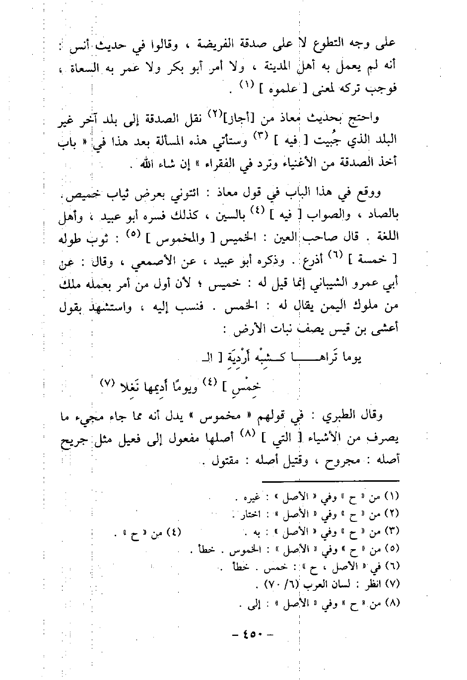 على وجه التطوع لا على صدقة الفريضة، وقالوا فى حديث أنس: أنه لم يعمل به أهل المدينة، ولا أمر أبو بكر ولا عمر به السعاة، فوجب تركه لمعنى علموه. واحتج بحديث معاذ من أجاز نقل الصدقة إلى بلد آخر غير البلد الذى جُبيت فيه وستأتى هذه المسألة بعد هذا فى باب (أخذ الصدقة من الأغنياء وترد فى الفقراء) ، إن شاء الله. ووقع فى هذا الباب فى قول معاذ: ائتونى بعرض ثياب خميص بالصاد، والصواب فيه بالسين، كذلك فسره أبو عبيد، وأهل اللغة. قال صاحب العين: الخميس والمخموس: ثوب طوله خمسة أذرع. وذكره أبو عبيد، عن الأصمعى، وقال: عن أبى عمرو الشيبانى إنما قيل له: خميس، لأن أول من أمر بعمله ملك من ملوك اليمن يقال له: الخمس. فنسب إليه، واستشهد بقول أعشى بن قيس يصف نبات الأرض: يوما تَراها كشِبْه أَرْدِيِةَ ال خِمْسِ ويومًا أَدِيمها نَغِلا وقال الطبرى: فى قولهم: (مخموس) يدل أنه مما جاء مجىء ما يصرف من الأشياء التى أصلها مفعول إلى فعيل مثل جريج أصله: مجروح، وقتيل أصله: مقتول.