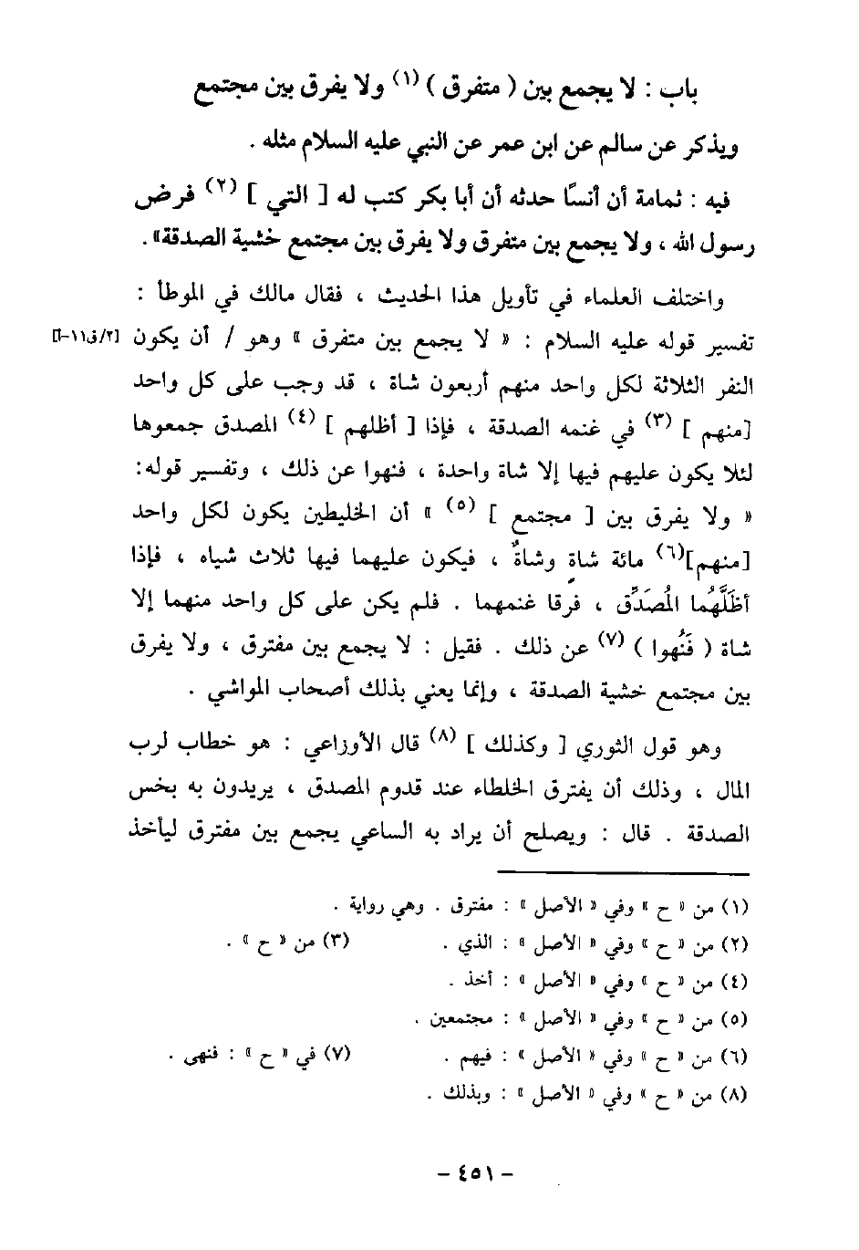 وَيُذْكَرُ عَنْ سَالِمٍ، عَنِ ابْنِ عُمَرَ، عَنِ النَّبِىِّ (صلى الله عليه وسلم) مِثْلَهُ. / 43 - فيه: ثُمَامَةُ، أَنَّ أَنَسًا حَدَّثَهُ أَنَّ أَبَا بَكْرٍ، كَتَبَ لَهُ الَّتِى فَرَضَ رَسُولُ اللَّهِ (صلى الله عليه وسلم) : (وَلا يُجْمَعُ بَيْنَ مُتَفَرِّقٍ، وَلا يُفَرَّقُ بَيْنَ مُجْتَمِعٍ خَشْيَةَ الصَّدَقَةِ) . واختلف العلماء فى تأويل هذا الحديث، فقال مالك فى الموطأ: تفسير قوله (صلى الله عليه وسلم) : (لا يجمع بين متفرق) وهو أن يكون النفر الثلاثة لكل واحد منهم أربعون شاة، قد وجب على كل واحد منهم فى غنمه الصدقة، فإذا أظلهم المصدق جمعوها لئلا يكون عليهم فيها إلا شاة واحدة، فنهوا عن ذلك، وتفسير قوله: (ولا يفرق بين مجتمع) أن الخليطين يكون لكل واحد منهم مائة شاةٍ وشاةٌ، فيكون عليهما فيها ثلاث شياه، فإذا أظَلَّهُما المُصَدِّق، فرقا غنمهما، فلم يكن على كل واحد منهما إلا شاة فنهوا عن ذلك. فقيل: لا يجمع بين مفترق، ولا يفرق بين مجتمع خشية الصدقة، وإنما يعنى بذلك أصحاب المواشى. وهو قول الثورى، وكذلك قال الأوزاعى: هو خطاب لرب المال، وذلك أن يفترق الخلطاء عند قدوم المصدق، يريدون به بخس الصدقة. قال: ويصلح أن يراد به الساعى يجمع بين مفترق ليأخذ