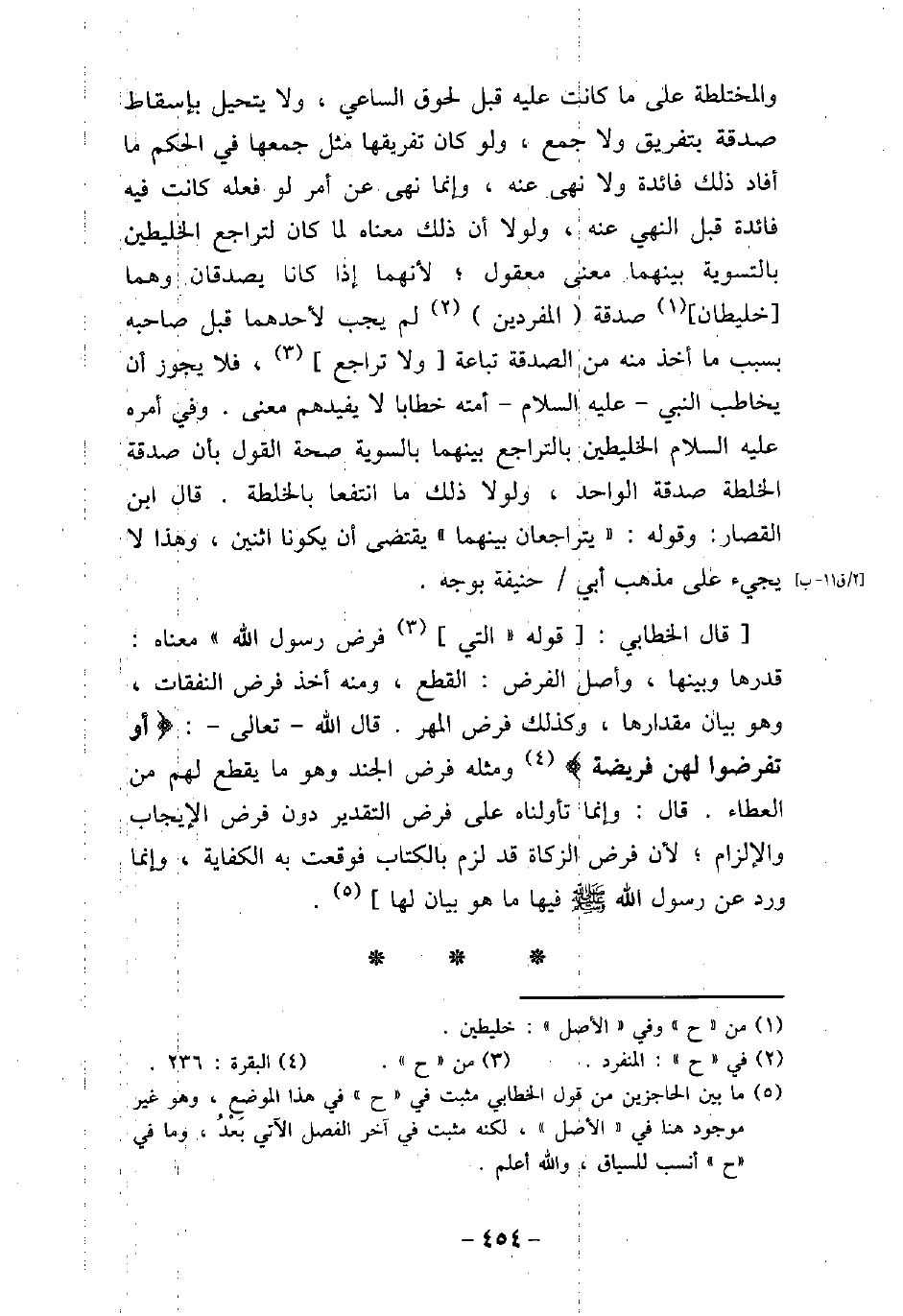 والمختلطة على ما كانت عليه قبل لحوق الساعى، ولا يتحيل بإسقاط صدقة بتفريق ولا جمع، ولو كان تفريقها مثل جمعها فى الحكم ما أفاد ذلك فائدة ولا نهى عنه، وإنما نهى عن أمر لو فعله كانت فيه فائدة قبل النهى عنه، ولولا أن ذلك معناه لما كان لتراجع الخليطين بالتسوية بينهما معنى معقول، لأنهما إذا كانا يصدقان وهما خليطان صدقة المفردين لم يجب لأحدهما قبل صاحبه بسبب ما أخذ منه من الصدقة تباعة ولا تراجع، فلا يجوز أن يخاطب النبى، (صلى الله عليه وسلم) ، أمته خطابًا لا يفيدهم معنى. وفى أمره (صلى الله عليه وسلم) الخليطين بالتراجع بينهما بالسوية صحة القول بأن صدقة الخلطة صدقة الواحد، ولولا ذلك ما انتفعا بالخلطة. قال ابن القصار: وقوله: (يتراجعان بينهما) يقتضى أن يكونا اثنين، وهذا لا يجىء على مذهب أبى حنيفة بوجه. قال الخطابى: قوله: (التى فرض رسول الله) معناه: قدرها وبينها، وأصل الفرض: القطع، ومنه أخذ فرض النفقات، وهو بيان مقدارها، وكذلك فرض المهر. قال الله تعالى: (أو تفرضوا لهن فريضة) [البقرة: 236] ، ومثله فرض الجند، وهو ما يقطع لهم من العطاء. قال: وإنما تأولناه على فرض التقدير دون فرض الإيجاب والإلزام؛ لأن فرض الزكاة قد لزم بالكتاب فوقعت به الكفاية، وإنما ورد عن رسول الله (صلى الله عليه وسلم) فيها ما هو بيان لها.