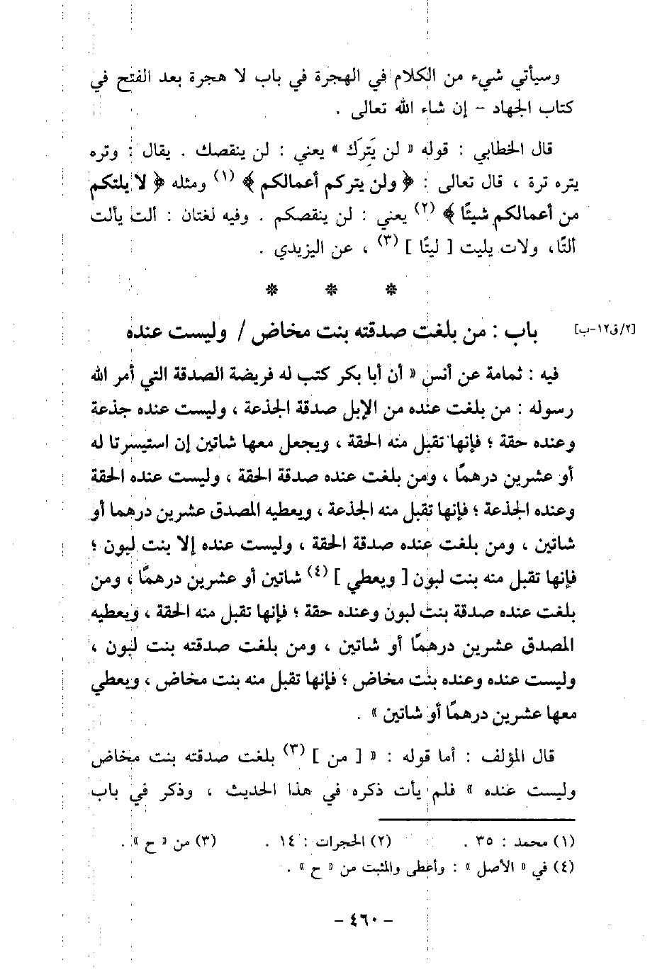 / 46 - فيه: ثُمَامَةُ، عن أَنَس، أَنَّ أَبَا بَكْرٍ كَتَبَ لَهُ فَرِيضَةَ الصَّدَقَةِ الَّتِى أَمَرَ اللَّهُ رَسُولَهُ (صلى الله عليه وسلم) : (مَنْ بَلَغَتْ عِنْدَهُ مِنَ الإبِلِ صَدَقَةُ الْجَذَعَةِ، وَلَيْسَتْ عِنْدَهُ جَذَعَةٌ، وَعِنْدَهُ حِقَّةٌ، فَإِنَّهَا تُقْبَلُ مِنْهُ الْحِقَّةُ، وَيَجْعَلُ مَعَهَا شَاتَيْنِ إِنِ اسْتَيْسَرَتَا لَهُ أَوْ عِشْرِينَ دِرْهَمًا، وَمَنْ بَلَغَتْ عِنْدَهُ صَدَقَةُ الْحِقَّةِ، وَلَيْسَتْ عِنْدَهُ الْحِقَّةُ، وَعِنْدَهُ الْجَذَعَةُ، فَإِنَّهَا تُقْبَلُ مِنْهُ الْجَذَعَةُ، وَيُعْطِيهِ الْمُصَدِّقُ عِشْرِينَ دِرْهَمًا أَوْ شَاتَيْنِ، وَمَنْ بَلَغَتْ عِنْدَهُ صَدَقَةُ الْحِقَّةِ، وَلَيْسَتْ عِنْدَهُ إِلا بِنْتُ لَبُونٍ، فَإِنَّهَا تُقْبَلُ مِنْهُ بِنْتُ لَبُونٍ، وَيُعْطِى شَاتَيْنِ أَوْ عِشْرِينَ دِرْهَمًا، وَمَنْ بَلَغَتْ عنده صَدَقَة بِنْتَ لَبُونٍ، وَعِنْدَهُ حِقَّةٌ، فَإِنَّهَا تُقْبَلُ مِنْهُ الْحِقَّةُ، وَيُعْطِيهِ الْمُصَدِّقُ عِشْرِينَ دِرْهَمًا أَوْ شَاتَيْنِ، وَمَنْ بَلَغَتْ صَدَقَتُهُ بِنْتَ لَبُونٍ، وَلَيْسَتْ عِنْدَهُ، وَعِنْدَهُ بِنْتُ مَخَاضٍ، فَإِنَّهَا تُقْبَلُ مِنْهُ بِنْتُ مَخَاضٍ، وَيُعْطِى مَعَهَا عِشْرِينَ دِرْهَمًا أَوْ شَاتَيْنِ) . قال المؤلف: أما قوله: (من بلغت صدقته بنت مخاض وليست عنده) ، فلم يأت ذكره فى هذا الحديث، وذكر فى باب
