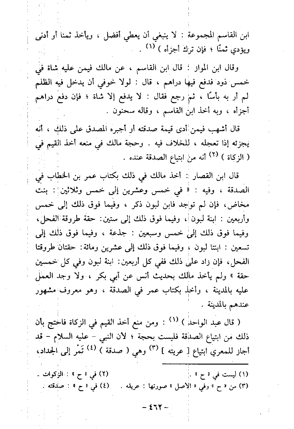 ابن القاسم فى المجموعة: لا ينبغى أن يعطى أفضل، ويأخذ ثمنًا، أو أدنى ويؤدى ثمنًا، فإن ترك أجزأه. وقال ابن المواز: قال ابن القاسم، عن مالك فيمن عليه شاة فى خمس ذود فدفع فيها دراهم، قال: لولا خوفى أن يدخل فيه الظلم لم أر به بأسًا، ثم رجع فقال: لا يدفع إلا شاة، فإن دفع دراهم أجزأه، وبه أخذ ابن القاسم، وقاله سحنون. قال أشهب فيمن أدى قيمة صدقته أو أجبره المصدق على ذلك: أنه يجزئه إذا تعجله، للخلاف فيه. وحجة مالك فى منعه أخذ القيم فى الزكاة أنه من ابتياع الصدقة عنده. قال ابن القصار: أخذ مالك فى ذلك بكتاب عمر بن الخطاب فى الصدقة، وفيه: (فى خمس وعشرين إلى خمس وثلاثين: بنت مخاض، فإن لم توجد فابن لبون ذكر، وفيما فوق ذلك إلى خمس وأربعين: ابنة لبون، وفيما فوق ذلك إلى ستين: حقة طروقة الفحل، وفيما فوق ذلك إلى خمس وسبعين: جذعة، وفيما فوق ذلك إلى تسعين: ابنتا لبون، وفيما فوق ذلك إلى عشرين ومائة: حقتان طروقتا الفحل، فإن زاد على ذلك ففى كل أربعين: ابنة لبون، وفى كل خمسين حقة) . ولم يأخذ مالك بحديث أنس، عن أبى بكر، ولا وجد العمل عليه بالمدينة، وأخذ بكتاب عمر فى الصدقة، وهو معروف مشهور عندهم بالمدينة. قال عبد الواحد: ومن منع أخذ القيم فى الزكاة فاحتج بأن ذلك من ابتياع الصدقة فليست بحجة، لأن النبى، (صلى الله عليه وسلم) ، قد أجاز للمعرى ابتياع عريته، وهى صدقة تَمْر إلى الجداد،