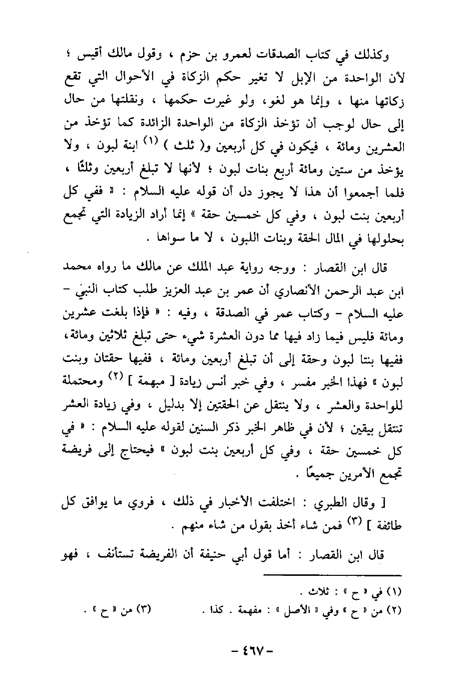 وكذلك فى كتاب الصدقات لعمرو بن حزم، وقول مالك أقيس، لأن الواحدة من الإبل لا تغير حكم الزكاة فى الأحوال التى تقع زكاتها منها، وإنما هو لغو، ولو غيرت حكمها، ونقلتها من حال إلى حال لوجب أن تؤخذ الزكاة من الواحدة الزائدة كما تؤخذ من العشرين ومائة، فيكون فى كل أربعين وثلث ابنه لبون، ولا يؤخذ من ستين ومائة أربع بنات لبون، لأنها لا تبلغ أربعين وثلثًا، فلما أجمعوا أن هذا لا يجوز دل أن قوله (صلى الله عليه وسلم) : (ففى كل أربعين بنت لبون، وفى كل خمسين حقة) إنما أراد الزيادة التى تجمع بحلولها فى المال الحقة وبنات اللبون، لا ما سواها. قال ابن القصار: ووجه رواية عبد الملك عن مالك ما رواه محمد بن عبد الرحمن الأنصارى، أن عمر بن عبد العزيز طلب كتاب النبى، (صلى الله عليه وسلم) ، وكتاب عمر فى الصدقة، وفيه: (فإذا بلغت عشرين ومائة فليس فيما زاد فيها مما دون العشرة شىء حتى تبلغ ثلاثين ومائة، ففيها بنتا لبون وحقة إلى أن تبلغ أربعين ومائة، ففيها حقتان وبنت لبون) . فهذا الخبر مفسر، وفى خبر أنس زيادة مبهمة ومحتملة للواحدة والعشر، ولا ينتقل عن الحقتين إلا بدليل، وفى زيادة العشر تنتقل بيقين، لأن فى ظاهر الخبر ذكر السنين لقوله (صلى الله عليه وسلم) : (فى كل خمسين حقة، وفى كل أربعين بنت لبون) ، فيحتاج إلى فريضة تجمع الأمرين جميعًا. وقال الطبرى: اختلفت الأخبار فى ذلك، فروى ما يوافق كل طائفة فمن شاء أخذ بقول من شاء منهم. قال ابن القصار: أما قول أبى حنيفة أن الفريضة تستأنف، فهو