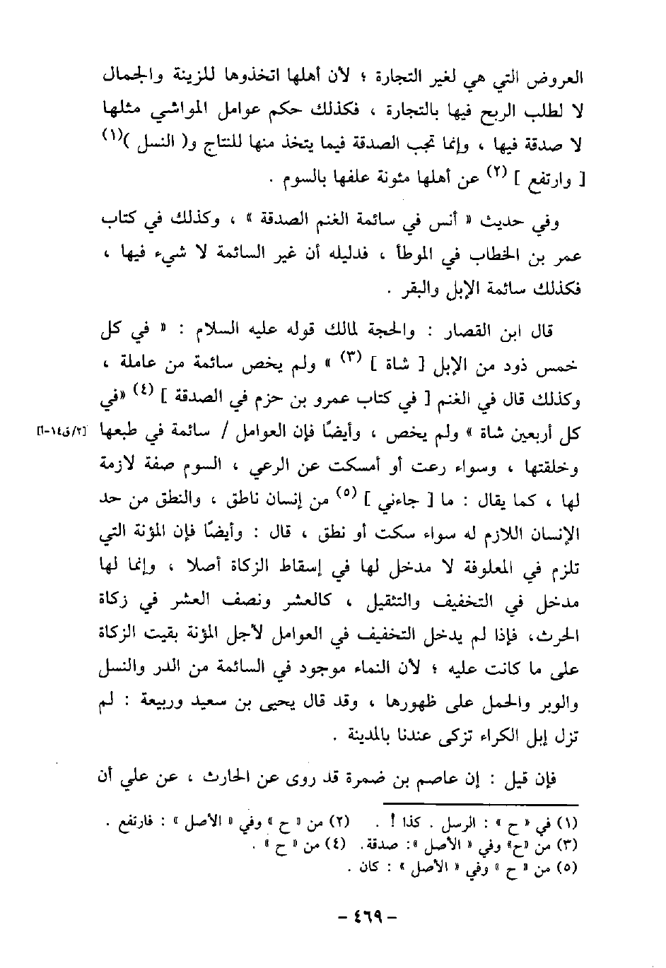 العروض التى هى لغير التجارة، لأن أهلها اتخذوها للزينة والجمال لا لطلب الربح فيها بالتجارة، فكذلك حكم عوامل المواشى مثلها لا صدقة فيها، وإنما تجب الصدقة فيما يتخذ منها للنتاج والنسل وارتفع عن أهلها مئونة علفها بالسوم. وفى حديث أنس: (فى سائمة الغنم الصدقة) ، وكذلك فى كتاب عمر بن الخطاب فى (الموطأ) ، فدليله أن غير السائمة لا شىء فيها، فكذلك سائمة الإبل والبقر. قال ابن القصار: والحجة لمالك قوله (صلى الله عليه وسلم) : (فى كل خمس ذود من الإبل شاة) ، ولم يخص سائمة من عاملة، وكذلك قال فى الغنم فى كتاب عمرو بن حزم فى الصدقة: (فى كل أربعين شاة) ولم يخص، وأيضًا فإن العوامل سائمة فى طبعها وخلقتها، وسواء رعت، أو أمسكت عن الرعى، السوم صفة لازمة لها، كما يقال: ما جاءنى من إنسان ناطق، والنطق من حد الإنسان اللازم له سواء سكت أو نطق، قال: وأيضًا فإن المؤنة التى تلزم فى المعلوفة لا مدخل لها فى إسقاط الزكاة أصلاً، وإنما لها مدخل فى التخفيف والتثقيل، كالعشر ونصف العشر فى زكاة الحرث، فإذا لم يدخل التخفيف فى العوامل لأجل المؤنة بقيت الزكاة على ما كانت عليه، لأن النماء موجود فى السائمة من الدر والنسل والوبر والحمل على ظهورها، وقد قال يحيى بن سعيد وربيعة: لم تزل إبل الكراء تزكى عندنا بالمدينة. فإن قيل: إن عاصم بن ضمرة قد روى عن الحارث، عن على أن