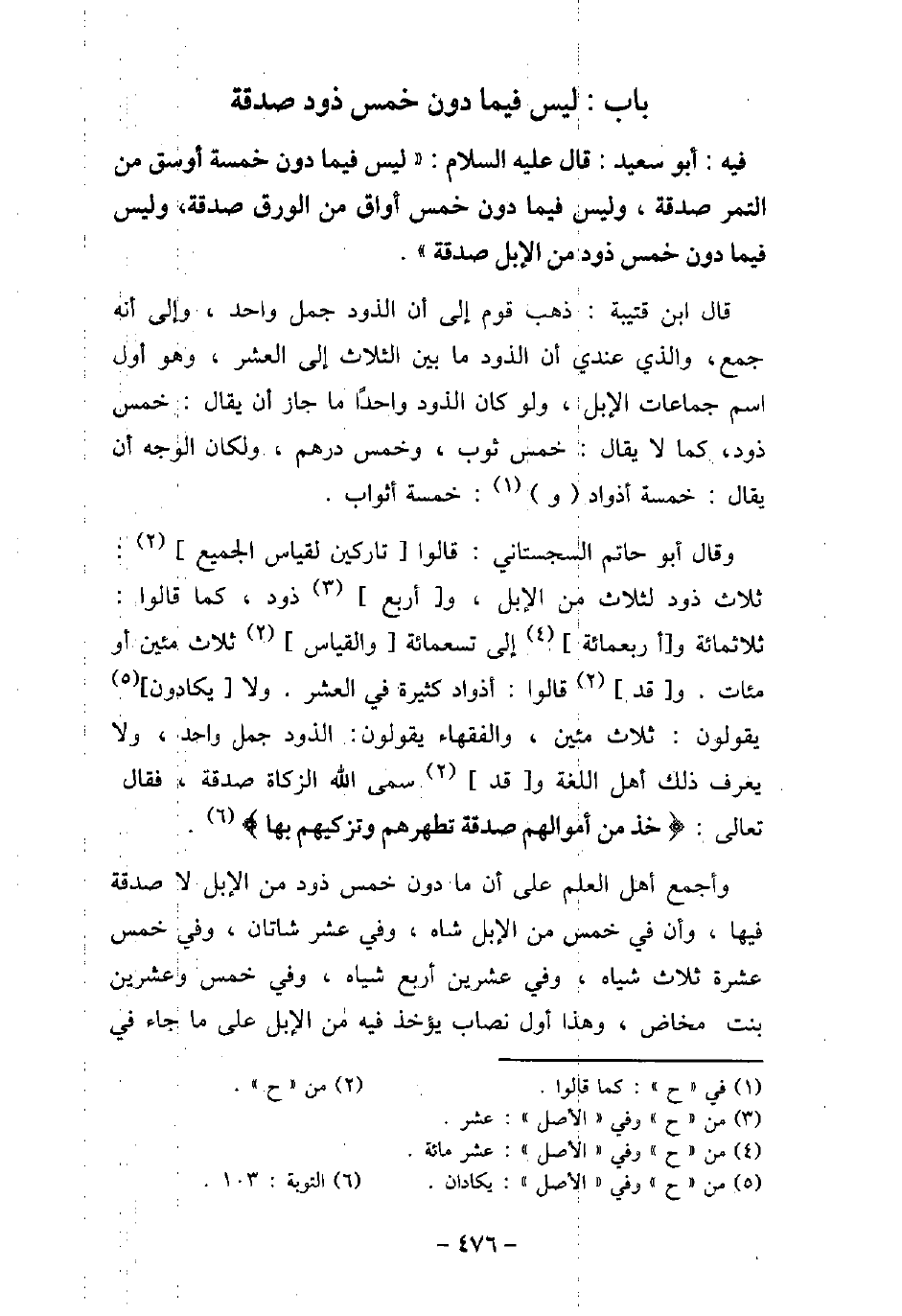 / 51 - فيه: أَبُو سَعِيد، قَالَ (صلى الله عليه وسلم) : (لَيْسَ فِيمَا دُونَ خَمْسَةِ أَوْسُقٍ مِنَ التَّمْرِ صَدَقَةٌ، وَلَيْسَ فِيمَا دُونَ خَمْسِ أَوَاقٍ مِنَ الْوَرِقِ صَدَقَةٌ، وَلَيْسَ فِيمَا دُونَ خَمْسِ ذَوْدٍ مِنَ الإبِلِ صَدَقَةٌ) . قال ابن قتيبة: ذهب قوم إلى أن الذود جمل واحد، وإلى أنه جمع، والذى عندى أن الذود ما بين الثلاث إلى العشر، وهو أول اسم جماعات الإبل، ولو كان الذود واحدًا ما جاز أن يقال: خمس ذود، كما لا يقال: خمس ثوب، وخمس درهم، ولكان الوجه أن يقال: خمسة أذواد و: خمسة أثواب. وقال أبو حاتم السجستانى: قالوا تاركين لقياس الجميع: ثلاث ذود لثلاث من الإبل، وأربع ذود، كما قالوا: ثلاثمائة وأربعمائة إلى تسعمائة والقياس ثلاث مئين، أو مئات. وقد قالوا: أذواد كثيرة فى العشر، ولا يكادون يقولون: ثلاث مئين، والفقهاء يقولون: الذود جمل واحد، ولا يعرف ذلك أهل اللغة وقد سمى الله الزكاة صدقة، فقال تعالى: (خذ من أموالهم صدقة تطهرهم وتزكيهم بها) [التوبة: 103] . وأجمع أهل العلم على أن ما دون خمس ذود من الإبل لا صدقة فيها، وأن فى خمس من الإبل شاة، وفى عشر شاتان، وفى خمس عشرة ثلاث شباه، وفى عشرين أربع شياه، وفى خمس عشرين بنت مخاض، وهذا أول نصاب يؤخذ فيه من الإبل على ما جاء فى