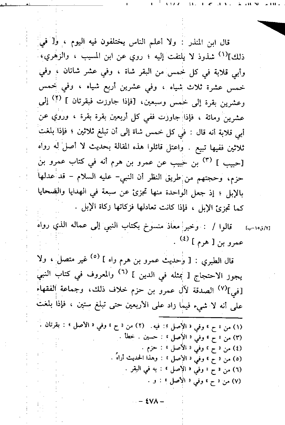 قال ابن المنذر: ولا أعلم الناس يختلفون فيه اليوم، وفى ذلك شذوذ لا يلتفت إليه، روى عن ابن المسيب، والزهرى، وأبى قلابة فى كل خمس من البقر شاة، وفى عشر شاتان، وفى خمس عشرة ثلاث شياه، وفى عشرين أربع شياه، وفى خمس وعشرين بقرة إلى خمس وسبعين، فإذا جاوزت فبقرتان إلى عشرين ومائة، فإذا جاوزت ففى كل أربعين بقرة بقرة. وروى عن أبى قلابة أنه قال: فى كل خمس شاة إلى أن تبلغ ثلاثين، فإذا بلغت ثلاثين ففيها تبيع، واعتل قائلوا هذه المقالة بحديث لا أصل له رواه حبيب بن حبيب، عن عمرو بن هرم، أنه فى كتاب عمرو بن حزم، وحجتهم من طريق النظر أن النبى، (صلى الله عليه وسلم) ، قد عدلها بالإبل، إذ جعل الواحدة منها تجزئ عن سبعة فى الهدايا والضحايا كما تجزئ الإبل، فإذا كانت تعادلها فزكاتها زكاة الإبل. قالوا: وخبر معاذ منسوخ بكتاب النبى (صلى الله عليه وسلم) إلى عماله الذى رواه عمرو بن هرم. قال الطبرى: وحديث عمرو بن هرم واه غير متصل، ولا يجوز الاحتجاج بمثله فى الدين والمعروف فى كتاب النبى (صلى الله عليه وسلم) فى الصدقة لآل عمرو بن حزم خلاف ذلك، وجماعة الفقهاء على أنه لا شىء فيما زاد على الأربعين حتى تبلغ ستين، فإذا بلغت