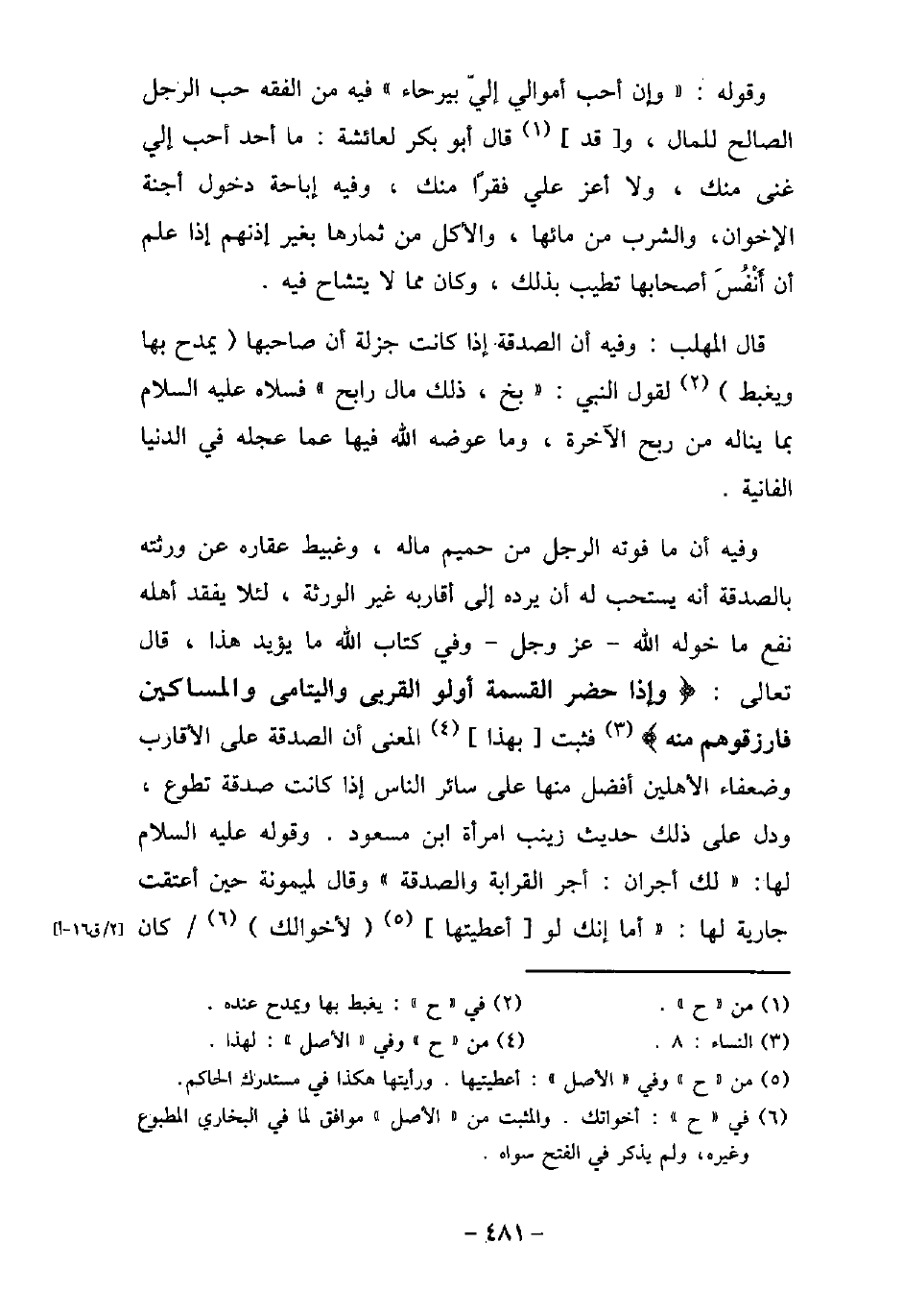 وقوله: (وإن أحب أموالى إلى بيرحاء) فيه من الفقه: حب الرجل الصالح للمال، وقد قال أبو بكر لعائشة: ما أحد أحب إلى غنى منك، ولا أعز على فقرًا منك. وفيه: إباحة دخول أجنة الإخوان، والشرب من مائها، والأكل من ثمارها بغير إذنهم إذا علم أن أَنْفُسَ أصحابها تطيب بذلك، وكان مما لا يتشاح فيه. قال المهلب: وفيه أن الصدقة إذا كانت جزلة أن صاحبها يمدح بها ويغبط لقول النبى (صلى الله عليه وسلم) : (بخ، ذلك مال رابح) فسلاه (صلى الله عليه وسلم) بما يناله من ربح الآخرة، وما عوضه الله فيها عما عجله فى الدنيا الفانية. وفيه: أن ما فوته الرجل من حميم ماله، وغبيط عقاره عن ورثته بالصدقة أنه يستحب له أن يرده إلى أقاربه غير الورثة، لئلا يفقد أهله نفع ما خوله الله، عز وجل، وفى كتاب الله ما يؤيد هذا، قال تعالى: (وإذا حضر القسمة أولو القربى واليتامى والمساكين فارزقوهم منه) [النساء: 8] فثبت بهذا المعنى أن الصدقة على الأقارب وضعفاء الأهلين أفضل منها على سائر الناس إذا كانت صدقة تطوع، ودل على ذلك حديث زينب امرأة ابن مسعود. وقوله (صلى الله عليه وسلم) لها: (لك أجران: أجر القرابة والصدقة) وقال لميمونة حين أعتقت جارية لها: (أما إنك لو أعطيتها لأخوالك كان