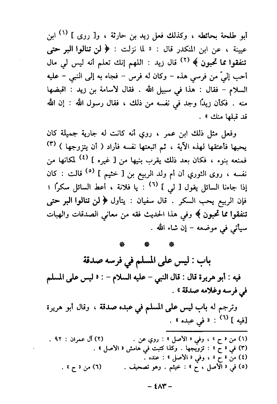 أبو طلحة بحائطه، وكذلك فعل زيد بن حارثة، وروى ابن عيينة، عن ابن المنكدر، قال: (لما نزلت: (لن تنالوا البر حتى تنفقوا مما تحبون) [آل عمران: 92] ، قال زيد: اللهم إنك تعلم أنه ليس لى مال أحب إلىّ من فرسى هذه، وكان له فرس، فجاء به إلى النبى، (صلى الله عليه وسلم) ، فقال: هذا فى سبيل الله. فقال لأسامة بن زيد: (اقبضها منه) ، فكأن زيدًا وجد فى نفسه من ذلك، فقال رسول الله (صلى الله عليه وسلم) : (إن الله قد قبلها منك) . وفعل مثل ذلك ابن عمر، روى أنه كانت له جارية جميلة كان يحبها فأعتقها لهذه الآية، ثم اتبعتها نفسه، فأراد أن يتزوجها فمنعه بنوه، فكان بعد ذلك يقرب بنيها من غيره لمكانها من نفسه، روى الثورى أن أم ولد الربيع بن خثيم، قالت: كان إذا جاءنا السائل يقول لى: يا فلانة، أعط السائل سكرًا؛ فإن الربيع يحب السكر. قال سفيان: يتأول) لن تنالوا البر حتى تنفقوا مما تحبون (، وفى هذا الحديث فقه من معانى الصدقات والهبات، سيأتى فى موضعه، إن شاء الله.
