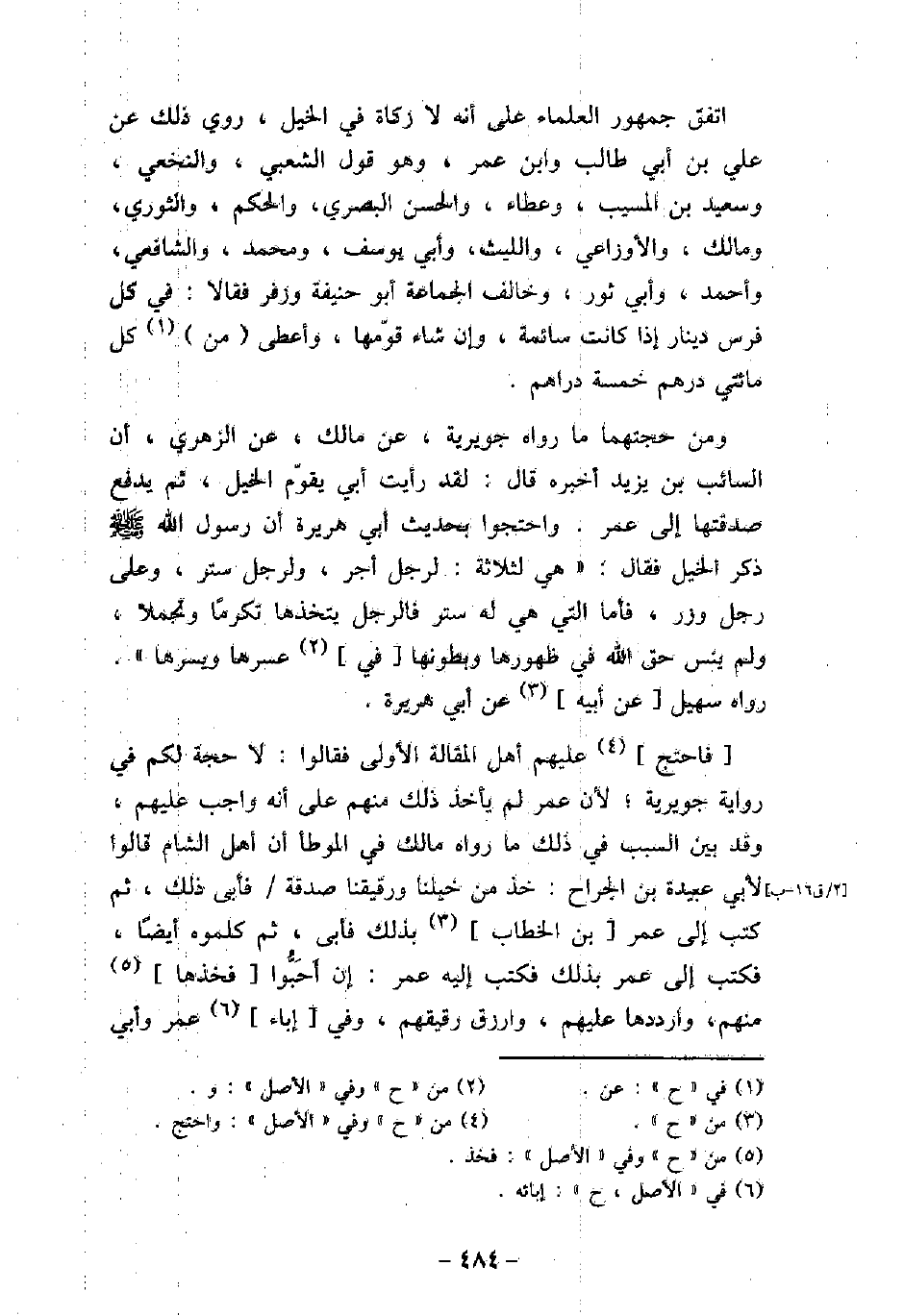 اتفق جمهور العلماء على أنه لا زكاة فى الخيل، روى ذلك عن على بن أبى طالب، وابن عمر، وهو قول الشعبى، والنخعى، وسعيد بن المسيب، وعطاء، والحسن البصرى، والحكم، والثورى، ومالك، والأوزاعى، والليث، وأبى يوسف، ومحمد، والشافعى، وأحمد، وأبى ثور، وخالف الجماعة أبو حنيفة وزفر، فقالا: فى كل فرس دينار إذا كانت سائمة، وإن شاء قومها، وأعطى من كل مائتى درهم خمسة دراهم. ومن حجتهما ما رواه جويرية، عن مالك، عن الزهرى، أن السائب بن يزيد أخبره، قال: لقد رأيت أبى يقوّم الخيل، ثم يدفع صدقتها إلى عمر. واحتجوا بحديث أبى هريرة، أن رسول الله (صلى الله عليه وسلم) ذكر الخيل، فقال: (هى لثلاثة: لرجل أجر، ولرجل ستر، وعلى رجل وزر، فأما التى هى له ستر فالرجل يتخذها تكرمًا وتجملاً، ولم ينس حق الله فى ظهورها وبطونها فى عسرها ويسرها) . رواه سهيل، عن أبيه، عن أبى هريرة. فاحتج عليهم أهل المقالة الأولى، فقالوا: لا حجة لكم فى رواية جويرية، لأن عمر لم يأخذ ذلك منهم على أنه واجب عليهم، وقد بين السبب فى ذلك ما رواه مالك فى الموطأ أن أهل الشام، قالوا لأبى عبيدة بن الجراح: خذ من خيلنا ورقيقنا صدقة فأبى ذلك، ثم كتب إلى عمر بن الخطاب بذلك فأبى، ثم كلموه أيضًا، فكتب إلى عمر بذلك، فكتب إليه عمر: إن أَحَبُّوا فخذها منهم، وارددها عليهم، وارزق رقيقهم، وفى إباء عمر، وأبى