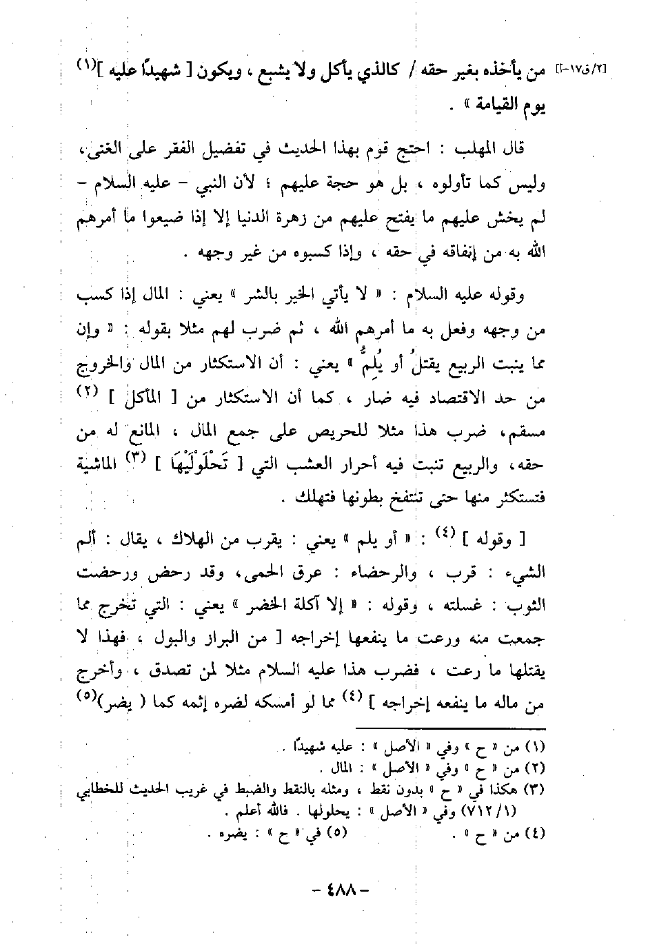 مَنْ يَأْخُذُهُ بِغَيْرِ حَقِّهِ كَالَّذِى يَأْكُلُ وَلا يَشْبَعُ، وَيَكُونُ شَهِيدًا عَلَيْهِ يَوْمَ الْقِيَامَةِ) . قال المهلب: احتج قوم بهذا الحديث فى تفضيل الفقر على الغنى، وليس كما تأولوه، بل هو حجة عليهم، لأن النبى، (صلى الله عليه وسلم) ، لم يخش عليهم ما يفتح عليهم من زهرة الدنيا إلا إذا ضيعوا ما أمرهم الله به من إنفاقه فى حقه، وإذا كسبوه من غير وجهه. وقوله (صلى الله عليه وسلم) : (لا يأتى الخير بالشر) يعنى المال إذا كسب من وجهه وفعل به ما أمرهم الله، ثم ضرب لهم مثلاً بقوله: (وإن مما ينبت الربيع يقتلُ أو يُلِمُّ) يعنى أن الاستكثار من المال والخروج من حد الاقتصاد فيه ضار، كما أن الاستكثار من المأكل مسقم، ضرب هذا مثلاً للحريص على جمع المال، المانع له من حقه، والربيع تنبت فيه أحرار الشعب التى تَحْلَوْلَيْهَا الماشية فتستكثر منها حتى تنتفخ بطونها فتهلك. وقوله: (أو يلم) يعنى يقرب من الهلاك، يقال: ألم الشىء: قرب، والرحضاء: عرق الحمى، وقد رحض ورحضت الثوب: غسلته، وقوله: (إلا آكلة الخضر) يعنى التى تخرج مما جمعت منه ورعت ما ينفعها إخراجه من البراز والبول، فهذا لا يقتلها ما رعت، فضرب هذا (صلى الله عليه وسلم) مثلاً لمن تصدق، وأخرج من ماله ما ينفعه إخراجه مما لو أمسكه لضره إثمه كما يضر