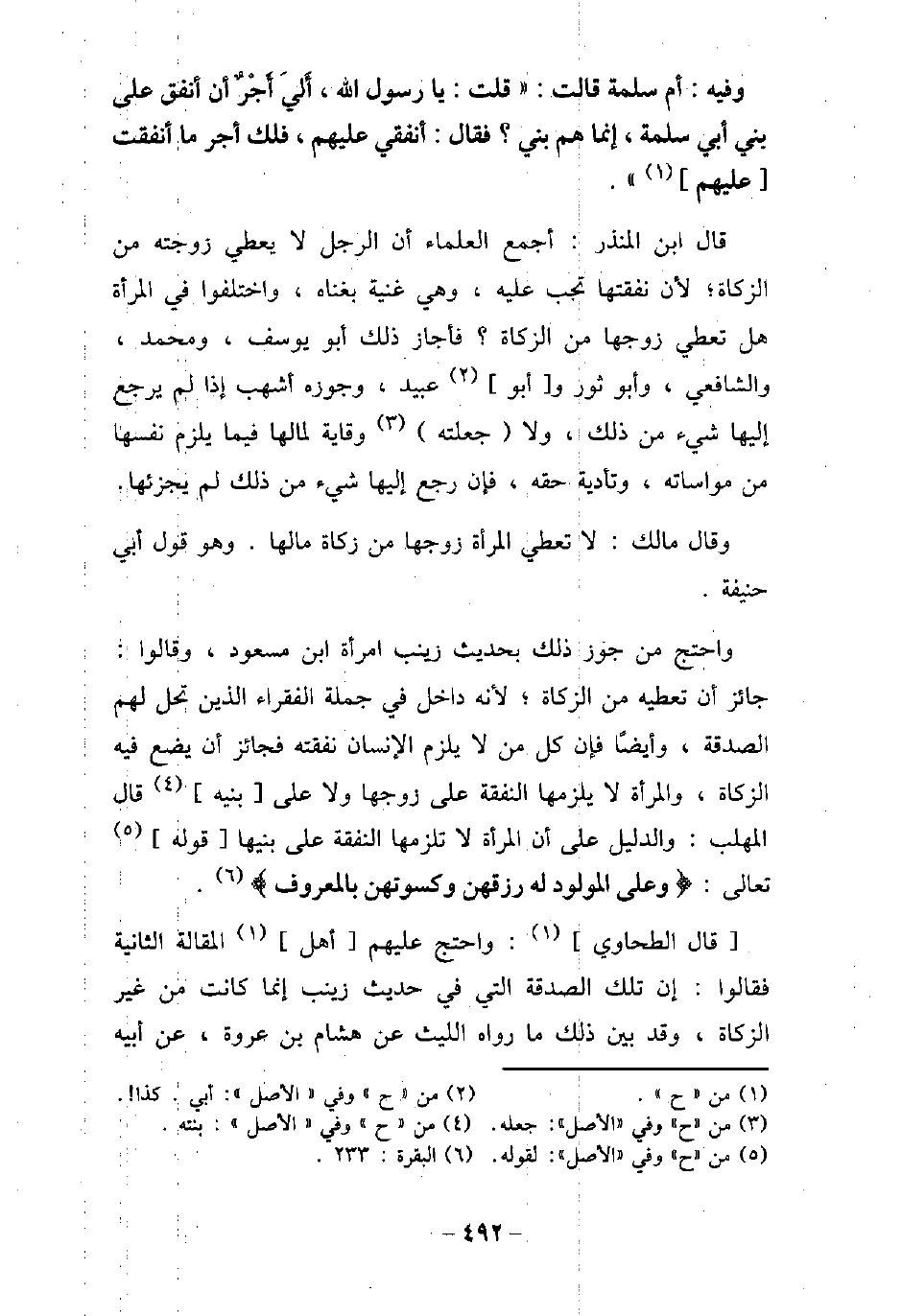 / 58 - وفيه: أُمِّ سَلَمَةَ، قَالَتْ: قُلْتُ: يَا رَسُولَ اللَّهِ، أَلِىَ أَجْرٌ أَنْ أُنْفِقَ عَلَى بَنِى أَبِى سَلَمَةَ، إِنَّمَا هُمْ بَنِىَّ، فَقَالَ: (أَنْفِقِى عَلَيْهِمْ، فَلَكِ أَجْرُ مَا أَنْفَقْتِ عَلَيْهِمْ) . قال ابن المنذر: أجمع العلماء أن الرجل لا يعطى زوجته من الزكاة، لأن نفقتها تجب عليه، وهى غنية بغناه، واختلفوا فى المرأة هل تعطى زوجها من الزكاة؟ فأجاز ذلك أبو يوسف، ومحمد، والشافعى، وأبو ثور، وأبو عبيد، وجوزه أشهب إذا لم يرجع إليها شىء من ذلك، ولا جعلته وقاية لمالها فيما يلزم نفسها من مواساته، وتأدية حقه، فإن رجع إليها شىء من ذلك لم يجزئها. وقال مالك: لا تعطى المرأة زوجها من زكاة مالها. وهو قول أبى حنيفة. واحتج من جوز ذلك بحديث زينب امرأة ابن مسعود، وقالوا: جائز أن تعطيه من الزكاة، لأنه داخل فى جملة الفقراء الذين تحل لهم الصدقة، وأيضًا فإن كل من لا يلزم الإنسان نفقته فجائز أن يضع فيه الزكاة، والمرأة لا يلزمها النفقة على زوجها، ولا على بنيه قال المهلب: والدليل على أن المرأة لا تلزمها النفقة على بنيها قوله تعالى: (وعلى المولود له رزقهن وكسوتهن بالمعروف) [البقرة: 233] . قال الطحاوى: واحتج عليهم أهل المقالة الثانية، فقالوا: إن تلك الصدقة التى فى حديث زينب إنما كانت من غير الزكاة، وقد بين ذلك ما رواه الليث عن هشام بن عروة، عن أبيه،