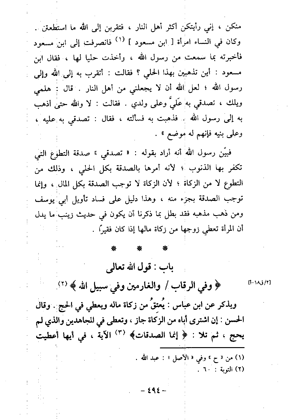 منكن، إنى رأيتكن أكثر أهل النار، فتقربن إلى الله ما استطعتن) . وكان فى النساء امرأة ابن مسعود، فانصرفت إلى ابن مسعود، فأخبرته بما سمعت من رسول الله (صلى الله عليه وسلم) ، وأخذت حليًا لها، فقال ابن مسعود: أين تذهبين بهذا الحلى؟ فقالت: أتقرب به إلى الله وإلى رسول الله (صلى الله عليه وسلم) ، لعل الله أن لا يجعلنى من أهل النار. قال: هلمى ويلك، تصدقى به عَلىَّ وعلى ولدى. فقالت: لا والله حتى أذهب به إلى رسول الله (صلى الله عليه وسلم) ، فذهبت به فسألته، فقال: (تصدقى به عليه، وعلى بنيه، فإنهم له موضع) . فبين رسول الله (صلى الله عليه وسلم) أنه أراد بقوله: (تصدقى) صدقة التطوع التى تكفر بها الذنوب، لأنه أمرها بالصدقة بكل الحلى، وذلك من التطوع لا من الزكاة، لأن الزكاة لا توجب الصدقة بكل المال، وإنما توجب الصدقة بجزء منه، وهذا دليل على فساد تأويل أبى يوسف، ومن ذهب مذهبه فقد بطل بما ذكرنا أن يكون فى حديث زينب ما يدل أن المرأة تعطى زوجها من زكاة مالها إذا كان فقيرًا.