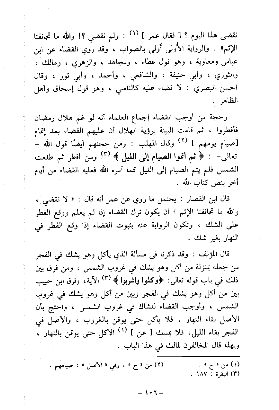 نقضي هذا اليوم؟ [فقال عمر] : ولم نقضي؟ والله ما تجانفنا الإثم '. والرواية الأولى أولى بالصواب، وقد روى القضاء عن ابن عباس ومعاوية، وهو قول عطاء، ومجاهد، والزهرى، ومالك، والثورى، وأبى حنيفة، والشافعى، وأحمد، وأبى ثور، وقال الحسن البصرى: لا قضاء عليه كالناسى، وهو قول إسحاق وأهل الظاهر. وحجة من أوجب القضاء إجماع العلماء أنه لو غم هلال رمضان فأفطروا، ثم قامت البينة برؤية الهلال أن عليهم القضاء بعد إتمام صيام يومهم، وقال المهلب: ومن حجتهم أيضًا قول الله تعالى: (ثُمَّ أَتِمُّوا الصِّيَامَ إِلَى الَّليْلِ) [البقرة: 187] ، ومن أفطر ثم طلعت الشمس فلم يتم الصيام إلى الليل كما أمره الله فعليه القضاء من أيام أخر بنص كتاب الله. قال ابن القصار: يحتمل ما روى عن عمر أنه قال: (لا نقضى، والله ما تجانفنا الإثم) ، أن يكون ترك القضاء إذا لم يعلم ووقع الفطر على الشك، وتكون الرواية عنه بثبوت القضاء إذا وقع الفطر فى النهار بغير شك. قال المؤلف: وقد ذكرنا فى مسألة الذى يأكل وهو يشك فى الفجر من جعله بمنزلة من أكل وهو يشك فى غروب الشمس، ومن فرق بين ذلك فى باب قوله تعالى: (وَكُلُوا وَاشْرَبُوا) [البقرة: 187] الآية، وفرق ابن حبيب بين من أكل وهو يشك فى الفجر وبين من أكل وهو يشك فى غروب الشمس، وأوجب القضاء للشاك فى غروب الشمس، واحتج بأن الأصل بقاء النهار، فلا يأكل حتى يوقن بالغروب، والأصل فى الفجر بقاء الليل، فلا يمسك عن الأكل حتى يوقن بالنهار، وبهذا قال المخالفون لمالك فى هذا الباب.
