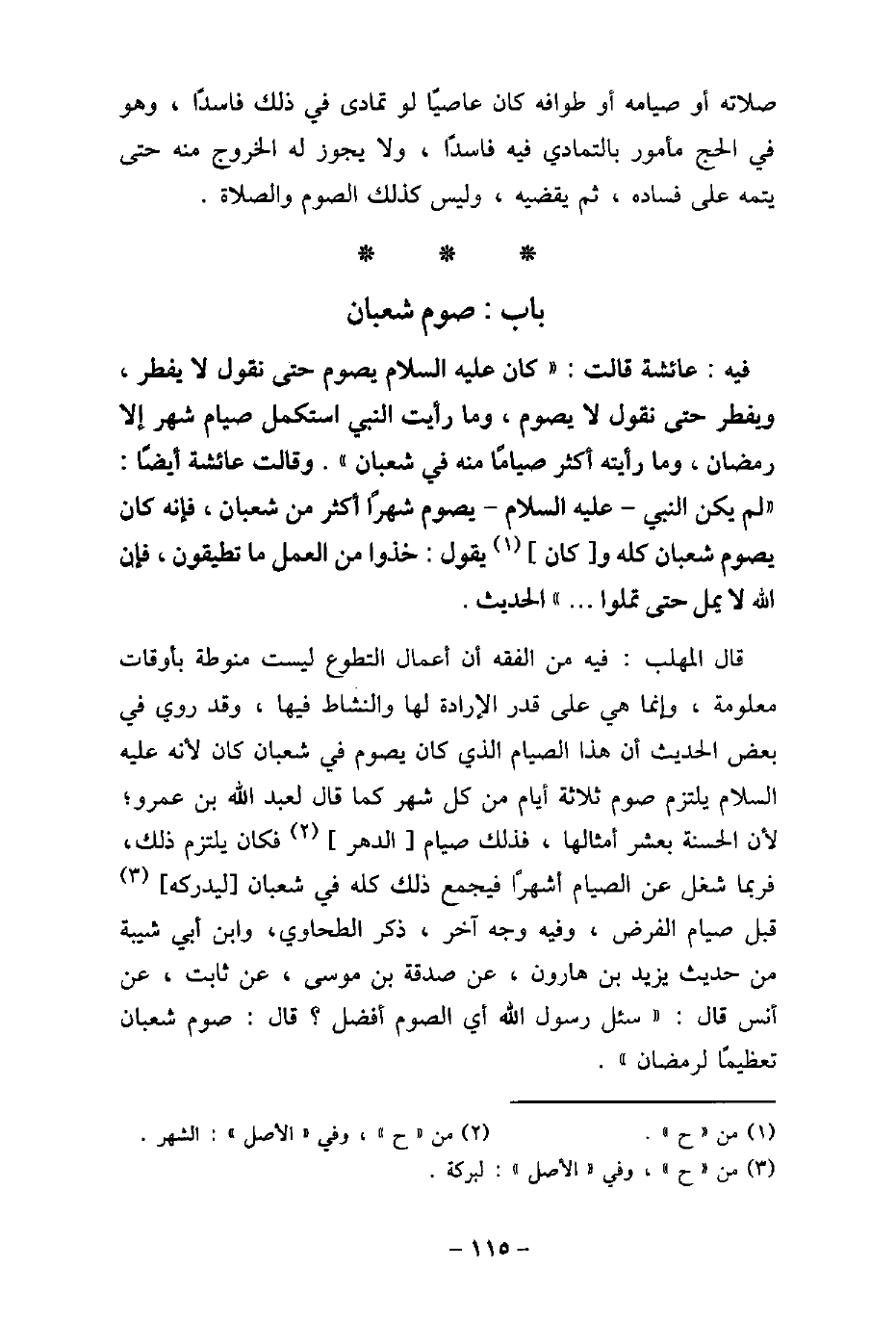 / 60 - فيه: عَائِشَةَ، قَالَتْ: (كَانَ عليه السلام، يَصُومُ حَتَّى نَقُولَ لا يُفْطِرُ، وَيُفْطِرُ حَتَّى نَقُولَ لا يَصُومُ، فَمَا رَأَيْتُ النبى اسْتَكْمَلَ صِيَامَ شَهْرٍ إِلا رَمَضَانَ، وَمَا رَأَيْتُهُ أَكْثَرَ صِيَامًا مِنْهُ فِى شَعْبَانَ) . وَقَالَتْ أيضًا: (لَمْ يَكُنِ النَّبِىُّ، عليه السلام، يَصُومُ شَهْرًا أَكْثَرَ مِنْ شَعْبَانَ، فَإِنَّهُ كَانَ يَصُومُ شَعْبَانَ كُلَّهُ، وَكَانَ يَقُولُ: خُذُوا مِنَ الْعَمَلِ مَا تُطِيقُونَ، فَإِنَّ اللَّهَ لا يَمَلُّ حَتَّى تَمَلُّوا. . .) الحديث. قال المهلب: فيه من الفقه أن أعمال التطوع ليست منوطة بأوقات معلومة، وإنما هى على قدر الإرادة لها والنشاط فيها، وقد روى فى بعض الحديث أن هذا الصيام الذى كان يصوم فى شعبان كان لأنه عليه السلام يلتزم صوم ثلاثة أيام من كل شهر كما قال لعبد الله بن عمرو، لأن الحسنة بعشر أمثالها، فذلك صيام الدهر فكان يلتزم ذلك، فربما شغل عن الصيام أشهرًا فيجمع ذلك كله فى شعبان ليدركه قبل صيام الفرض، وفيه وجه آخر، ذكر الطحاوى، وابن أبى شيبة من حديث يزيد بن هارون، عن صدقة بن موسى، عن ثابت، عن أنس، قال: سئل رسول الله أى الصوم أفضل؟ قال: (صوم شعبان تعظيمًا لرمضان) .
