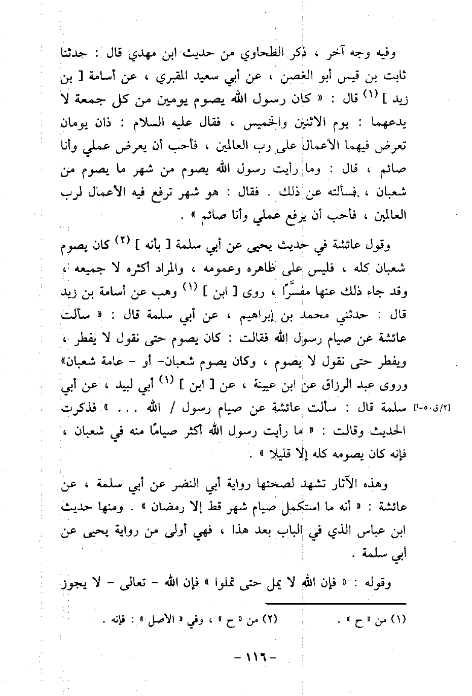 وفيه وجه آخر، ذكر الطحاوى من حديث ابن مهدى، قال: حدثنا ثابت بن قيس أبو الغصن، عن أبى سعيد المقبرى، عن أسامة بن زيد، قال: كان رسول الله يصوم يومين من كل جمعة لا يدعهما: يوم الاثنين والخمس، فقال عليه السلام: (هذان يومان تعرض فيهما الأعمال على رب العالمين، فأحب أن يعرض عملى وأنا صائم) ، قال: وما رأيت رسول الله يصوم من شهر ما يصوم من شعبان، فسألته عن ذلك. فقال: (هو شهر ترفع فيه الأعمال لرب العالمين، فأحب أن يرفع عملى وأنا صائم) . وقول عائشة فى حديث يحيى عن أبى سلمة بأنه كان يصوم شعبان كله، فليس على ظاهره وعمومه، والمراد أكثره لا جميعه، وقد جاء ذلك عنها مفسرًا، روى ابن وهب عن أسامة بن زيد، قال: حدثنى محمد بن إبراهيم، عن أبى سلمة، قال: (سألت عائشة عن صيام رسول الله فقالت كان يصوم حتى نقول لا يفطر، ويفطر حتى نقول لا يصوم، وكان يصوم شعبان، أو عامة شعبان) . وروى عبد الرزاق عن ابن عيينة، عن ابن أبى لبيد، عن أبى سلمة، قال: سألت عائشة عن صيام رسول الله. . .) فذكرت الحديث، وقالت: (ما رأيت رسول الله أكثر صيامًا منه فى شعبان، فإنه كان يصومه كله إلا قليلاً) . وهذه الآثار تشهد لصحتها رواية أبى النضر عن أبى سلمة، عن عائشة: (أنه ما استكمل صيام شهر قط إلا رمضان) ، ومنها حديث ابن عباس الذى فى الباب بعد هذا، فهى أولى من رواية يحيى عن أبى سلمة. وقوله: (فإن الله لا يمل حتى تملوا) ، فإن الله تعالى لا يجوز