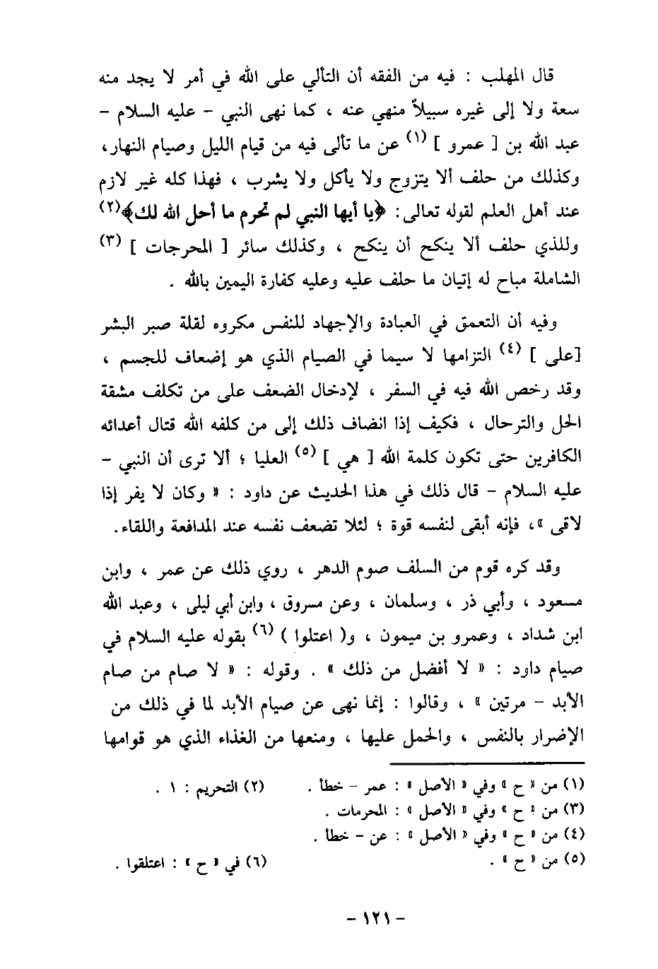 قال المهلب: فيه من الفقه أن التألى على الله فى أمر لا يجد منه سعة ولا إلى غيره سبيلاً منهى عنه، كما نهى النبى، عليه السلام، عبد الله بن عمرو عن ما تألى فيه من قيام الليل وصيام النهار، وكذلك من حلف ألا يتزوج ولا يأكل ولا يشرب، فهذا كله غير لازم عند أهل العلم لقوله تعالى: (يَا أَيُّهَا النَّبِىُّ لِمَ تُحَرِّمُ مَا أَحَلَّ اللَّهُ لَكَ) [التحريم: 1] وللذى حلف ألا ينكح أن ينكح، وكذلك سائر المحرجات الشاملة مباح له إتيان ما حلف عليه وعليه كفارة اليمين بالله. وفيه: أن التعمق فى العبادة والإجهاد للنفس مكروه لقلة صبر الشر على التزامها لا سيما فى الصيام الذى هو إضعاف للجسم، وقد رخص الله فيه فى السفر، لإدخال الضعف على من تكلف مشقة الحل والترحال، فكيف إذا انضاف ذلك إلى من كلفه الله قتال أعدائه الكافرين حتى تكون كلمة الله هى العليا، ألا ترى أن النبى، عليه السلام، قال ذلك فى هذا الحديث عن داود: (وكان لا يفر إذا لاقى) ، فإنه أبقى لنفسه قوة، لئلا تضعف نفسه عند المدافعة واللقاء. وقد كره قوم من السلف صوم الدهر، روى ذلك عن عمر، وابن مسعود، وأبى ذر، وسلمان، وعن مسروق، وابن أبى ليلى، وعبد الله بن شداد، وعمرو بن ميمون، واعتلوا بقوله عليه السلام فى صيام داود: (لا أفضل من ذلك) . وقوله: (لا صام من صام الأبد، مرتين) ، وقالوا: إنما نهى عن صيام الأبد لما فى ذلك من الإضرار بالنفس، والحمل عليها، ومنعها من الغذاء الذى هو قوامها