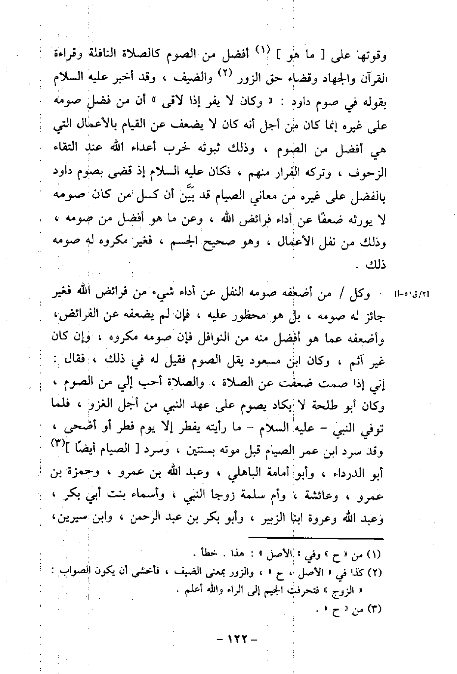 وقوتها على ما هو أفضل من الصوم كالصلاة النافلة وقراءة القرآن والجهاد وقضاء حق الزور والضعيف، وقد أخبر عليه السلام بقوله فى صوم داود: (وكان لا يفر إذا لاقى) ، أن من فضل صومه على غيره إنما كان من أجل أنه كان لا يضعف عن القيام بالأعمال التى هى الأفضل من الصوم، وذلك ثبوته لحرب أعداء الله عند التقاء الزحوف، وتركه الفرار منهم، فكان عليه السلاك إذ قضى بصوم داود بالفضل على غيره من معانى الصيام قد بين أن كل من كان صومه لا يورثه ضعفًا عن أداء فرائض الله، وعن ما هو أفضل من صومه، وذلك من نفل الأعمال، وهو صحيح الجسم، فغير مكروه له صومه ذلك. وكل من أضعفه صومه النفل عن أداء شىء من فرائض الله فغير جائز له صومه، بل هو محظور عليه، فإن لم يضعفه عن الفرائض، وأضعفه عما هو أفضل منه من النوافل فإن صومه مكروه، وإن كان غير آثم، وكان ابن مسعود يقل الصوم فقيل له فى ذلك، فقال: إنى إذا صمت ضعفت عن الصلاة، والصلاة أحب إلى من الصوم، وكان أبو طلحة لا يكاد يصوم على عهد النبى من أجل الغزو، فلما توفى النبى، عليه السلام، ما رأيته يفطر إلا يوم فطر أو أضحى، وقد سرد ابن عمر الصيام قبل موته بسنتين، وسرد الصيام أيضًا أبو الدرداء، وأبو أمامة الباهلى، وعبد الله بن عمرو، وحمزة بن عمرو، وعائشة، وأم سلمة زوجا النبى، وأسماء بنت أبى بكر، وعبد الله وعروة ابنا الزبير، وأبو بكر بن عبد الرحمن، وابن سيرين،