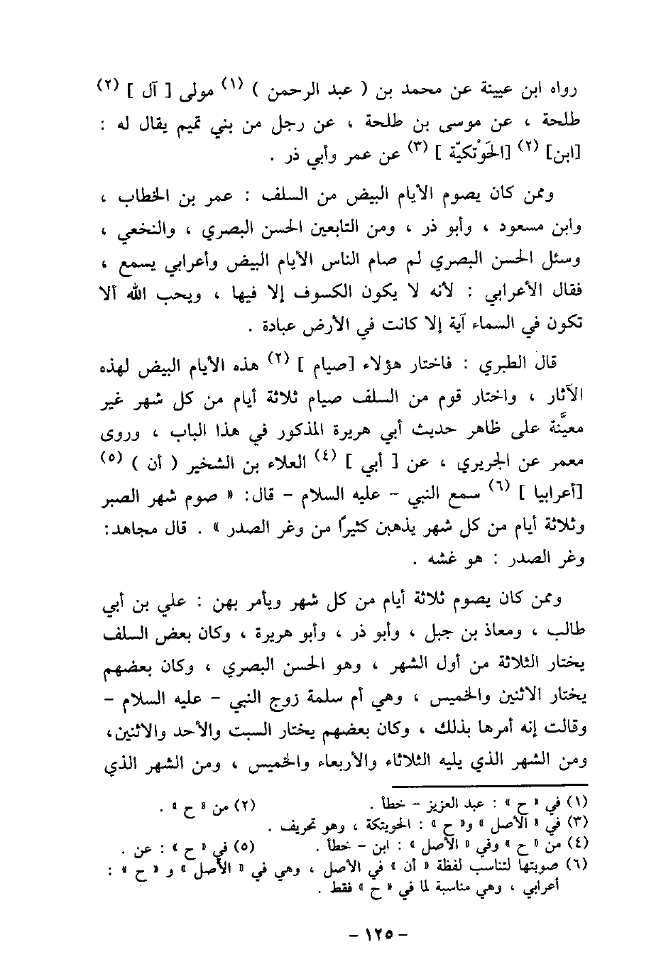 رواه ابن عيينة عن محمد بن عبد الرحمن مولى آل طلحة، عن موسى بن طلحة، عن رجل من بنى تميم يقال له: ابن الحَوْتكيّة عن عمرو، وأبى ذر. وممن كان يصوم الأيام البيض من السلف: عمر بن الخطاب، وابن مسعود، وأ [وذر، ومن التابعين الحسن البصرى، والنخعى، وسئل الحسن البصرى لم صام الناس الأيام البيض وأعرابى يسمع، فقال الأعرابى: لأنه لا يكون الكسوف إلآ فيها، ويحب الله ألا تكون فى السماء آية إلا كانت فى الأرض عبادة. قال الطبرى: فاختار هؤلاء صيام هذه الأيام البيض لهذه الآثار، واختار قوم من السلف صيام ثلاثة أيام من كل شهر غير معيَّنة على ظاهر حديث أ [ى هريرة المذكور فى هذا الباب، وروى معمر عن الجريرى، عن أبى العلاء بن الشخير أن أعرابيا سمع النبى، عليه السلام، قال: (صوم شهر الصبر وثلاثة أيام من كل شهر يذهبن كثيرًا من وغر الصدر) . قال مجاهد: وغر الصدر: هو غشه. وممن كان يصوم ثلاثة أيام من كل شهر ويأمر بهن: على بن أبى طالب، ومعاذ بن جبل، وأبو ذر، وأبو هريرة، وكان بعض السلف يختار الثلاثة من أول الشهر، وهو الحسن البصرى، وكان بعضهم يختار الاثنين والخميس، وهى أم سلمة زوج النبى، عليه السلام، وقالت إنه أمرها بذلك، وكان بعضهم يختار السبت والأحد والاثنين، ومن الشهر الذى يليه الثلاثاء والأربعاء والخميس، ومن الشهر الذى