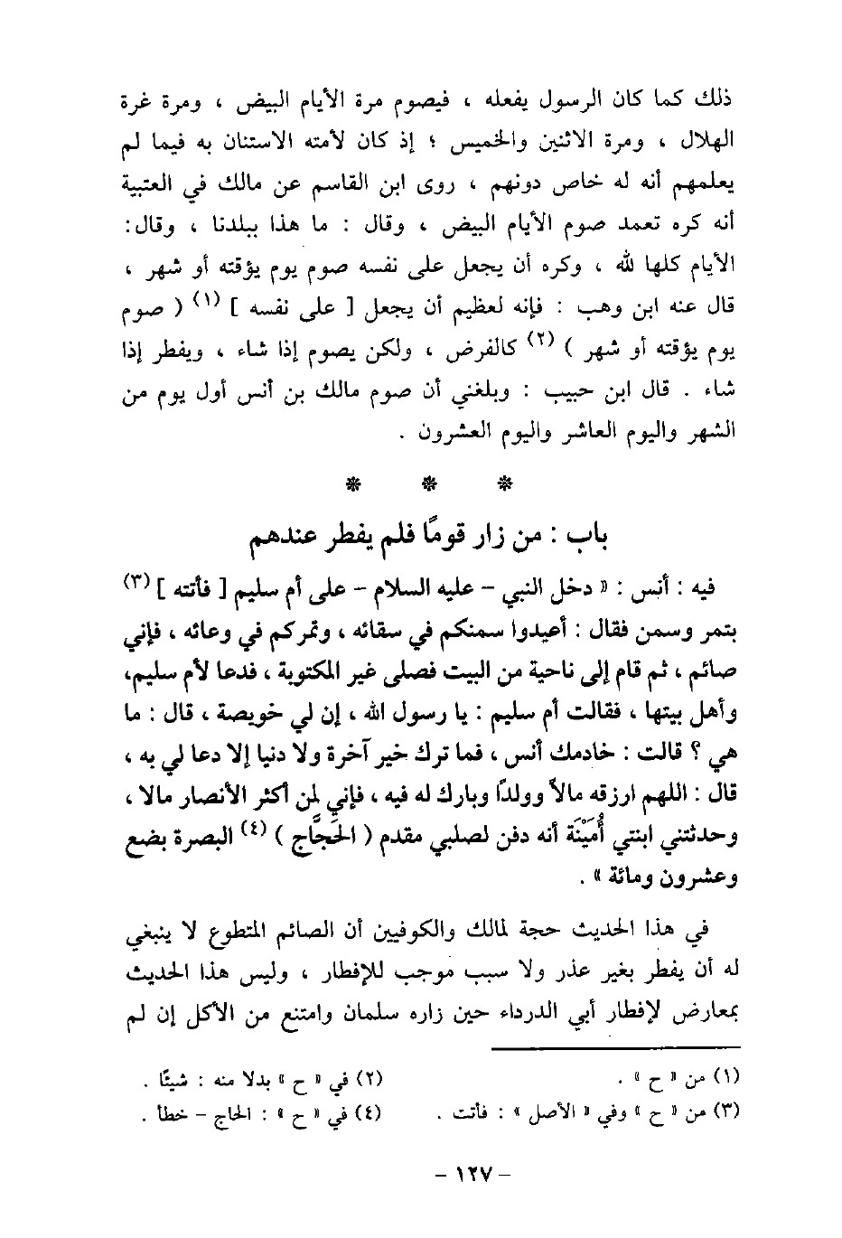 / 68 - فيه: أَنَسٍ: دَخَلَ النَّبِىُّ، عليه السلام، عَلَى أُمِّ سُلَيْمٍ، فَأَتَتْهُ بِتَمْرٍ وَسَمْنٍ، فَقَالَ: (أَعِيدُوا سَمْنَكُمْ فِى سِقَائِهِ، وَتَمْرَكُمْ فِى وِعَائِهِ، فَإِنِّى صَائِمٌ) ، ثُمَّ قَامَ إِلَى نَاحِيَةٍ مِنَ الْبَيْتِ، فَصَلَّى غَيْرَ الْمَكْتُوبَةِ، فَدَعَا لأمِّ سُلَيْمٍ، وَأَهْلِ بَيْتِهَا، فَقَالَتْ أُمُّ سُلَيْمٍ: يَا رَسُولَ اللَّهِ، إِنَّ لِى خُوَيْصَّةً، قَالَ: (مَا هِيَ) ؟ قَالَتْ: خَادِمُكَ أَنَسٌ، فَمَا تَرَكَ خَيْرَ آخِرَةٍ وَلا دُنْيَا إِلا دَعَا لِى بِهِ، قَالَ: (اللَّهُمَّ ارْزُقْهُ مَالاً وَوَلَدًا وَبَارِكْ لَهُ فِيهِ) ، فَإِنِّى لَمِنْ أَكْثَرِ الأنْصَارِ مَالا، وَحَدَّثَتْنِى ابْنَتِى أُمَيْنَةُ أَنَّهُ دُفِنَ لِصُلْبِى مَقْدَمَ الحَجَّاجٍ الْبَصْرَةَ بِضْعٌ وَعِشْرُونَ وَمِائَةٌ. فى هذا الحديث حجة لمالك والكوفيين أن الصائم المتطوع لا ينبغى له أن يفطر بغير عذر ولا سبب موجب للإفطار، وليس هذا الحديث بمعارض لإفطار أبى الدرداء حين زاره سلمان وامتنع من الأكل إن لم