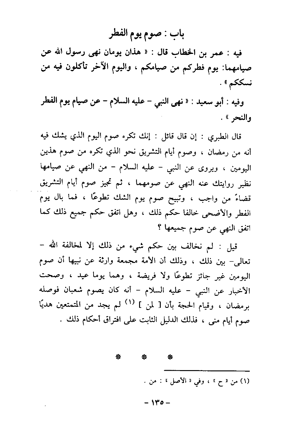 / 76 - فيه: عُمَر بْنِ الْخَطَّابِ، قَالَ: هَذَانِ يَوْمَانِ نَهَى رَسُولُ اللَّهِ (صلى الله عليه وسلم) عَنْ صِيَامِهِمَا، يَوْمُ فِطْرِكُمْ مِنْ صِيَامِكُمْ، وَالْيَوْمُ الآخَرُ تَأْكُلُونَ فِيهِ مِنْ نُسُكِكُمْ. / 77 - وفيه: أَبُو سَعِيد، نَهَى النَّبِىُّ، عليه السَّلام، عَنْ صَوْمِ يَوْمِ الْفِطْرِ وَالنَّحْرِ. قال الطبرى: إن قال قائل: إنك تكره صوم اليوم الذى يشك فيه أنه من رمضان، وصوم أيام التشريق نحو الذى تكره من صوم هذين اليومين، ويروى عن النبى عليه السلام من النهى عن صيامها نظير روايتك عنه النهى عن صومهما، ثم تجيز صوم أيام التشريق قضاءً من واجب، وتبيح صوم الشك تطوعًا، فما بال يوم الفطر والأضحى خالفا حكم ذلك، وهل اتفق حكم جميع ذلك كما اتفق النهى عن صوم جميعها. قيل: لم نخالف بين حكم شىء من ذلك إلا لمخالفة الله تعالى بين ذلك، وذلك أن الأمة مجمعة وارثة عن نبيها أن صوم اليومين غير جائز تطوعًا ولا فريضة، وهما يوما عيد، وصحت الأخبار عن النبى عليه السلام أنه كان يصوم شعبان فوصله برمضان، وقيام الحجة بأن لم يجد من المتمتعين هديًا صوم أيام منى، فذلك الدليل الثابت على افتراق أحكام ذلك.