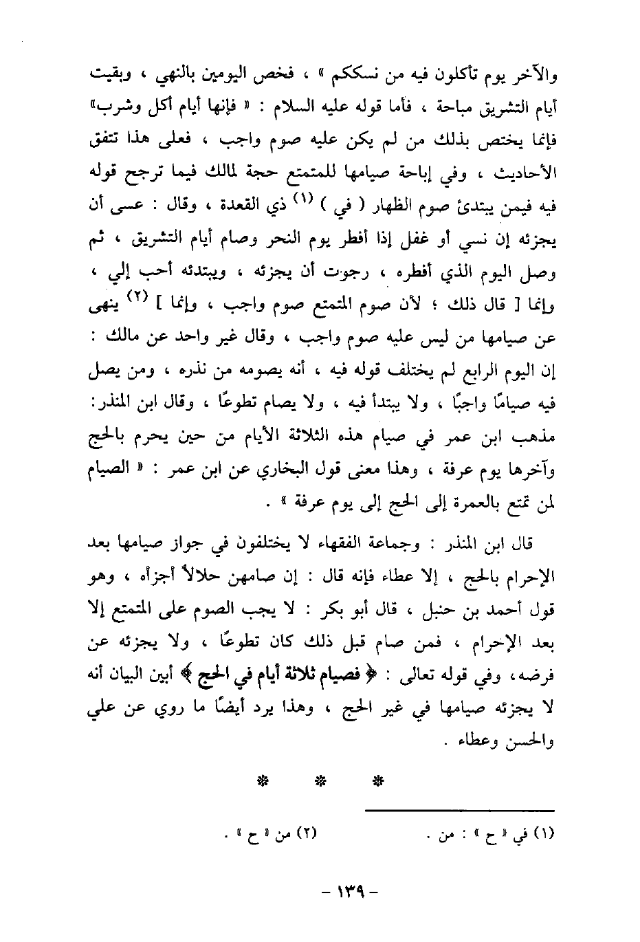والآخر يوم تاكلون فيه من نسككم) ، فخص اليومين بالنهى، وبقيت أيام التشريق مباحة، فأما قوله عليه السلام: (فإنها أيام أكل وشرب) فإنما يختص بذلك من لم يكن عليه صوم واجب، فعلى هذا تتفق الأحاديث، وفى إباحة صيامها للمتمتع حجة لمالك فيما ترجح قوله فيه فيمن يبتدئ صوم الظهار فى ذى القعدة، وقال: عسى أن يجزئه إن نسى أو غفل إذا أفطر يوم النحر وصام أيام التشريق، ثم وصل اليوم الذى أفطره، رجوت أن يجزئه، ويبتدئه أحب إلى، وإنما قال ذلك؛ لأن صوم المتمع صوم واجب، وإنما ينهى عن صيامها من ليس عليه صوم واجب، وقال غير واحد عن مالك: إن اليوم الرابع لم يختلف قوله فيه، ولا يصام تطوعًا، وقال ابن المنذر: مذهب ابن عمر فى صيام هذه الثلاثة الأيام من حين يحرم بالحج وآخرها يوم عرفة، وهذا معنى قول البخارى عن ابن عمر: (الصيام لمن تمتع بالعمرة إلى الحج إلى يوم عرفة) . قال ابن المنذر: وجماعة الفقهاء لا يختلفون فى جواز صيامها بعد الإجرام بالحج، إلا عطاء فإنه قال: إن صامهن حلالاً أجزأه، وهو قول أحمد بن حنبل، قال أبو بكر: لا يجب الصوم على المتمتع إلا بعد الإحرام، فمن صام قبل ذلك كان تطوعًا، ولا يجزئه عن فرضه، وفى قوله تعالى: (فَصِيَامُ ثَلاثَةِ أَيَّامٍ فِى الْحَجِّ) [البقرة: 296] أبين البيان أنه لا يجزئه صيامها فى غير الحج، وهذا يرد أيضًا ما روى عن على والحسن وعطاء.
