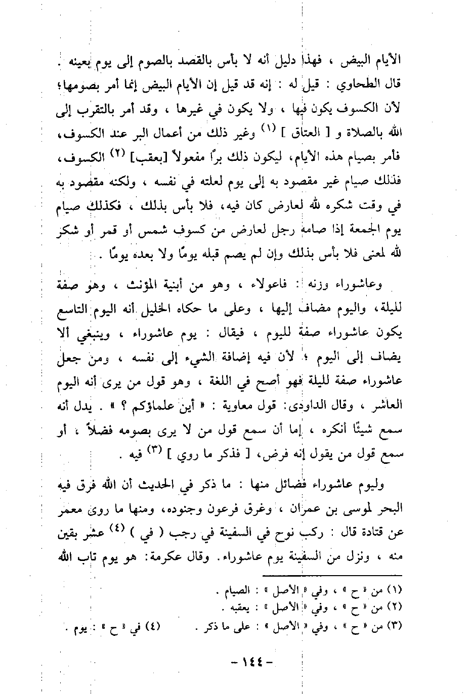 الأيام البيض، فهذا دليل أنه لا بأس بالقصد بالصوم إلى يوم بعينه. قال الطحاوى: قيل له: إنه قد قيل إن الأيام البيض إنما أمر بصومها؛ لأن الكسوف يكون فيها، ولا يكون فى غيرها، وقد أمر بالتقرب إلى الله بالصلاة والعتاق وغير ذلك من أعمال البر عند الكسوف، فأمر بصيام هذه الأيام، ليكون ذلك برًا مفعولاً بعقب الكسوف، فذلك صيام غير مقصود به إلى يوم لعلته فى نفسه، ولكنه مقصود به فى وقت شكره لله لعرض كان فيه، فلا بأس بذلك، فكذلك صيام يوم الجمعة إذا صامه رجل لعارض من كسوف شمس أو قمر أو شكر الله لمعنى فلا بأس بذلك وإن لم يصم قبله يومًا ولا بعده يومًا. وعاشوراء وزنه: فاعولا، وهو من أبنية المؤنث، وهو صفة لليلة، واليوم مضاف إليها، وعلى ما حكاه الخليل أنه اليوم التاسع يكون عاشوراء صفة لليوم، فيقال: سوم عاشوراء، وينبغى ألا يضاف إلى اليوم؛ لأن فيه إضافة الشىء إلى نفسه، ومن جعل عاشوراء صفة لليلة فهو أصح فى اللغة، وهو قول من يرى أنه اليوم العاشر، وقال الداودى: قول معاوية: (أين علماؤكم؟) . يدل أنه سمع شيئًا أنكره، إما أن سمع قول من لا يرى بصومه فضلاً، أو سمع قول من يقول إنه فرض، فذكر ما روى فيه. وليوم عاشوراء فضائل منها: ما ذكر فى الحديث أن الله فرق فيه البحر لموسى بن عمران، وغرق فرعون وجنوده، ومنها ما روى معمر عن قتادة قال: ركب نوح فى السفينة فى رجب فى عشر بقين منه، ونزل من السفينة يوم عاشوراء. وقال عكرمة: هو يوم تاب الله