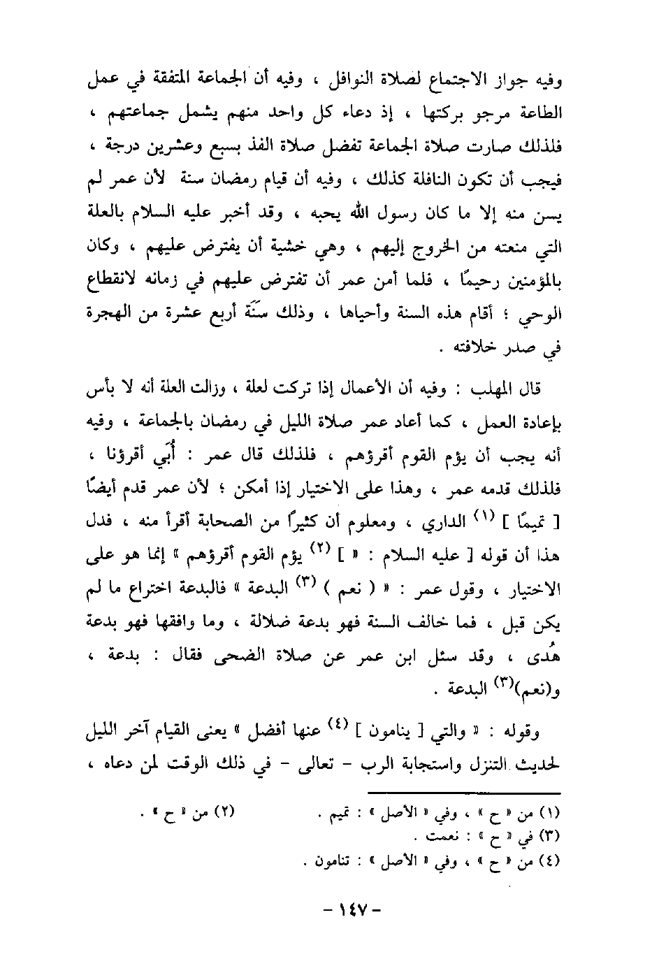وفيه جواز الاجتماع لصلاة النوافل، وفيه أن الجماعة المتفقة فى عمل الطاعة مرجو بركتها، إذ دعاء كل واحد منهم يشمل جماعتهم، فلذلك صارت صلاة الجماعة تفضل صلاة الفذ بسبع وعشرين درجة، فيجب أن تكون النافلة كذلك، وفيه أن قيام رمضان سنة لأن عمر لم يسن منه إلا ما كان رسول الله يحبه، وقد أخبر عليه السلام بالعلة التى منعته من الخروج إليهم، وهى خشية أن يفترض عليهم، وكان بالمؤمنين رحيمًا، فلما أمن عمر أن تفترض عليهم فى زمانه لانقطاع الوحى؛ أقام هذه السنة وأحياها، وذلك سنَةَ أربع عشرة من الهجرة فى صدر خلافته. قال المهلب: وفيه أن الأعمال إذا تركت لعلة، وزالت العلة أنه لا بأس بأعادة العمل، كما أمر عمر صلاة الليل فى رمضان بالجماعة، وفيه أنه يجب أن يؤم القوم أقرؤهم، فلذلك قال عمر: أُبَى أقرؤنا، فلذلك قدمه عمر، وهذا على الاختيار إذا أمكن؛ لأن عمر قدم أيضًا تميمًا الدارى، ومعلوم أن كثيرًا من الصحابة أقرأ منه، فدل هذا أن قوله عليه السلام: (يؤم القوم أقرؤهم) إنما هو على الاختيار، قول عمر: (نعم البدعة) فالبدعة اختراع ما لم يكن قبل، فما خالف السنة فهو بدعة ضلالة، وما وافقها فهو بدعة هُدى، وقد سئل ابن عمر عن صلاة الضحى فقال: بدعة، ونعم البدعة. وقوله: (والتى ينامون عنها أفضل) يعنى القيام آخر الليل لحديث التنزل واستجابة الرب تعالى فى ذلك الوقت لمن دعاه،