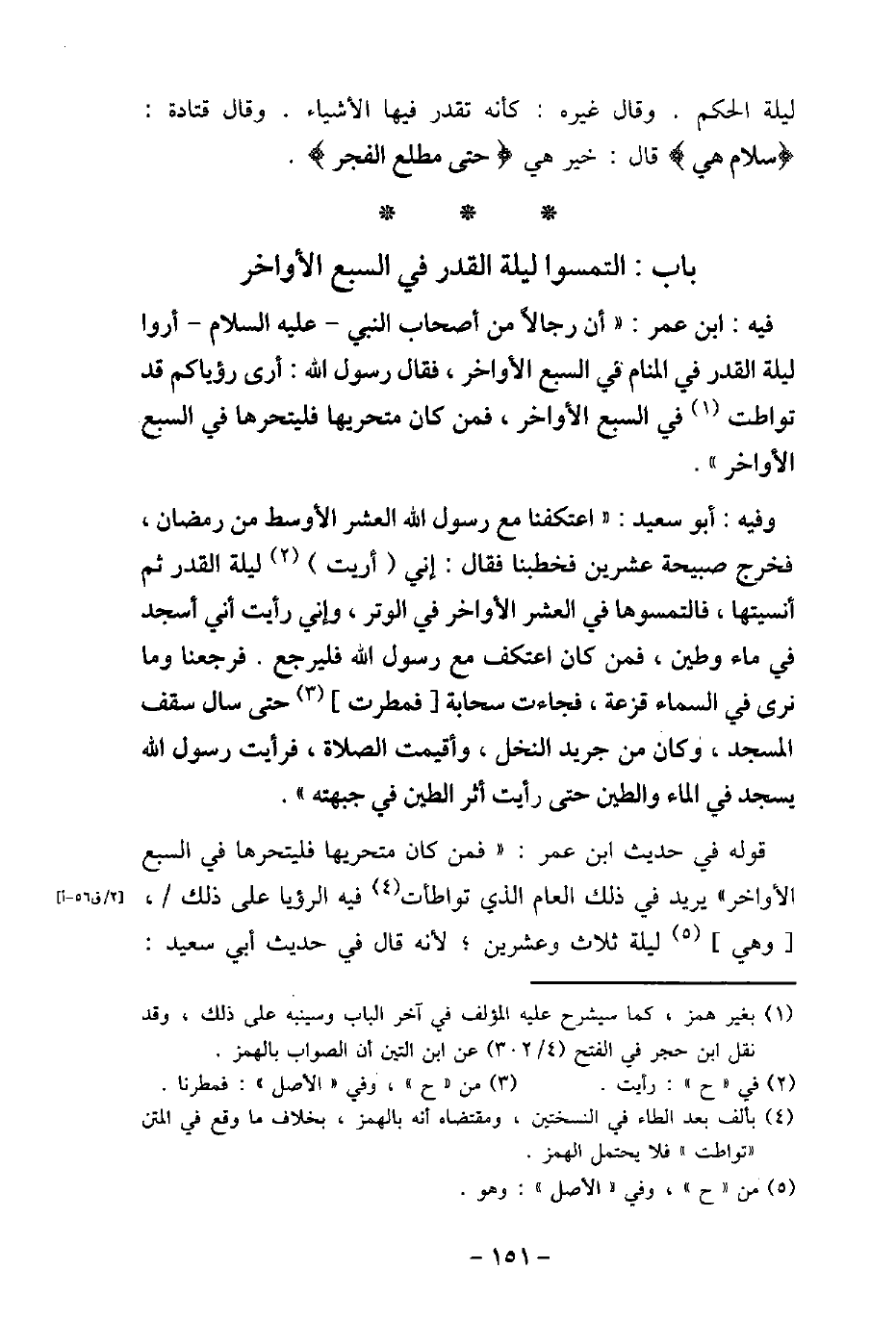 / 90 - فيه: ابْن عُمَرَ، أَنَّ رِجَالا مِنْ أَصْحَابِ النَّبِىِّ، عليه السَّلام، أُرُوا لَيْلَةَ الْقَدْرِ فِى الْمَنَامِ فِى السَّبْعِ الأوَاخِرِ، فَقَالَ رَسُولُ اللَّهِ (صلى الله عليه وسلم) : (أَرَى رُؤْيَاكُمْ قَدْ تَوَاطَأَتْ فِى السَّبْعِ الأوَاخِرِ، فَمَنْ كَانَ مُتَحَرِّيهَا، فَلْيَتَحَرَّهَا فِى السَّبْعِ الأوَاخِرِ) . / 91 - وفيه: أَبُو سَعِيد، اعْتَكَفْنَا مَعَ رسُولُ اللَّه (صلى الله عليه وسلم) الْعَشْرَ الأوْسَطَ مِنْ رَمَضَانَ، فَخَرَجَ صَبِيحَةَ عِشْرِينَ فَخَطَبَنَا، وَقَالَ: (إِنِّى أُرِيتُ لَيْلَةَ الْقَدْرِ، ثُمَّ أُنْسِيتُهَا، أَوْ نُسِّيتُهَا، فَالْتَمِسُوهَا فِى الْعَشْرِ الأوَاخِرِ فِى الْوَتْرِ، وَإِنِّى رَأَيْتُ أَنِّى أَسْجُدُ فِى مَاءٍ وَطِينٍ، فَمَنْ كَانَ اعْتَكَفَ مَعَ رَسُولِ اللَّهِ (صلى الله عليه وسلم) فَلْيَرْجِعْ) ، فَرَجَعْنَا، وَمَا نَرَى فِى السَّمَاءِ قَزَعَةً، فَجَاءَتْ سَحَابَةٌ، فَمَطَرَتْ حَتَّى سَالَ سَقْفُ الْمَسْجِدِ، وَكَانَ مِنْ جَرِيدِ النَّخْلِ، وَأُقِيمَتِ الصَّلاةُ، فَرَأَيْتُ رَسُولَ اللَّهِ (صلى الله عليه وسلم) يَسْجُدُ فِى الْمَاءِ وَالطِّينِ حَتَّى رَأَيْتُ أَثَرَ الطِّينِ فِى جَبْهَتِهِ. قوله فى حديث ابن عمر: (فمن كان متحريها فليتحراها فى السبع الأواخر) يريد فى ذلك العام الذى تواطأت فيه الرؤيا على ذلك، وهى ليلة ثلاث وعشرين؛ لأنه قال فى حديث أبى سعيد: