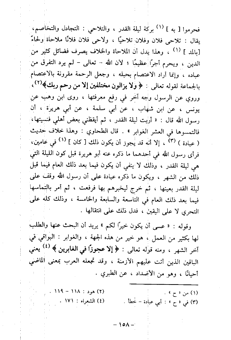 فحرموا به بركة ليلة القدر، والتلاحى: التجادل والتخاصم، يقال: تلاحى فلان وفلان تلاحيًا، ولاحى فلان فلانًا ملاحاة ولحاءً بالمد، وهذا يدل أن الملاحاة والخلاف يصرف فضائل كثير من الدين، ويحرم أجرًا عظيمًا؛ لأن الله تعالى لم يرد التفرق من عباده، وإنما أراد الاعتصام بحبله، وجعل الرحمة مقرونة بالاعتصام بالجماعة لقوله تعالى: (وَلاَ يَزَالُونَ مُخْتَلِفِينَ إِلاَّ مَن رَّحِمَ رَبُّكَ) [هود: 118، 119] ، وروى عن الرسول وجه آخر فى رفع معرفتها، روى ابن وهب عن يونس، عن ابن شهاب، عن أبى سلمة، عن أبى هريرة، أن رسول الله قال: (أريت ليلة القدر، ثم أيقظنى بعض أهلى فنسيتها، فالتمسوها فى العشر الغوابر) . قال الطحاوى: وهذا خلاف حديث عبادة، إلا أنه قد يجوز أن يكون ذلك كان فى عامين، فرأى رسول الله (صلى الله عليه وسلم) فى أحدهما ما ذكره عنه أبو هريرة قبل كون الليلة التى هى ليلة القدر، وذلك لا ينفى أن يكون فيما بعد ذلك العام فيما قبل ذلك من الشهر، ويكون ما ذكره عبادة على أن رسول الله (صلى الله عليه وسلم) وقف على ليلة القدر بعينها، ثم خرج ليخبرهم بها فرفعت، ثم أمر بالتماسها فيما بعد ذلك العام فى التاسعة والسابعة والخامسة، وذلك كله على التحرى لا على اليقين، فدل ذلك على انتقالها. وقوله: (عسى أن يكون خيرًا لكم) يريد أن البحث عنها والطلب لها بكثير من العمل، هو خير من هذه الجهة، والغوابر: البواقى فى آخر الشهر، ومنه قوله تعالى: (إِلاَّ عَجُوزًا فِى الْغَابِرِينَ) [الشعراء: 171] يعنى الباقين الذين أتت عليهم الأزمنة، وقد تجعله العرب بمعنى الماضى أحيانًا، وهو من الأضداد، عن الطبرى.