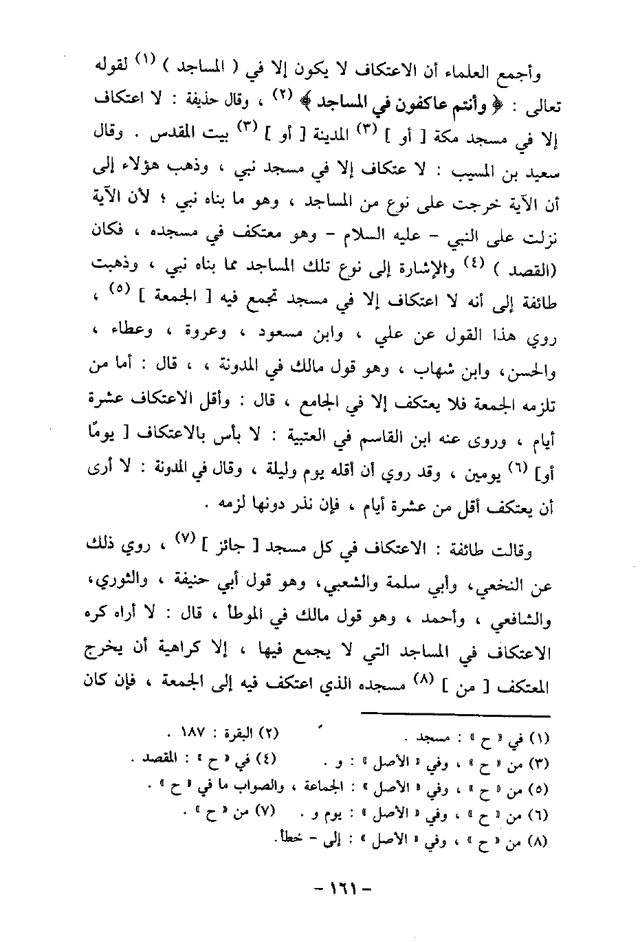 وأجمع العلماء أن الاعتكاف لا يكون إلا فى المساجد لقوله تعالى: (وَأَنْتُمْ عَاكِفُونَ فِى الْمَسَاجِدِ) [البقرة: 187] . وقال حذيفة: لا اعتكاف إلا فى مسجد مكة أو المدينة أو بيت المقدس. وقال سعيد بن المسيب: لا اعتكاف إلا فى مسجد نبى، وذهب هؤلاء إلى أن الآية خرجت على نوع من المساجد، وهو ما بناه نبى؛ لأن الآية نزلت على النبى عليه السلام وهو معتكف فى مسجده، فكان القصد والإشارة إلى نوع تلك المساجد مما بناه نبى، وذهبت طائفة إلى أنه لا اعتكاف إلا فى مسجد تجمع فيه الجمعة، روى هذا القول عن على، وابن مسعود، وعروة، وعطاء، والحسن، وابن شهاب، وهو قول مالك فى (المدونة) ، قال: أما من تلزمه الجمعة فلا يعتكف إلا فى الجامع، قال: وأقل الاعتكاف عشرة أيام، وروى عنه ابن القاسم فى العتبية: لا بأس بالاعتكاف يومًا أو يومين، وقد روى أن أقله يوم وليلة، وقال فى المدونة: لا أرى أن يعتكف أقل من عشرة أيام، فإن نذر دونها لزمه. وقالت طائفة: الاعتكاف فى كل مسجد جائز، روى ذلك عن النخعى، وأبى سلمة والشعبى، وهو قول أبى حنيفة، والثورى، والشافعى، وأحمد، وهو قول مالك فى (الموطأ) ، قال: لا أراه كره الاعتكاف فى المساجد التى لا يجمع فيها، إلا كراهية أن يخرج المعتكف من مسجده الذى اعتكف فيه إلى الجمعة، فإن كان