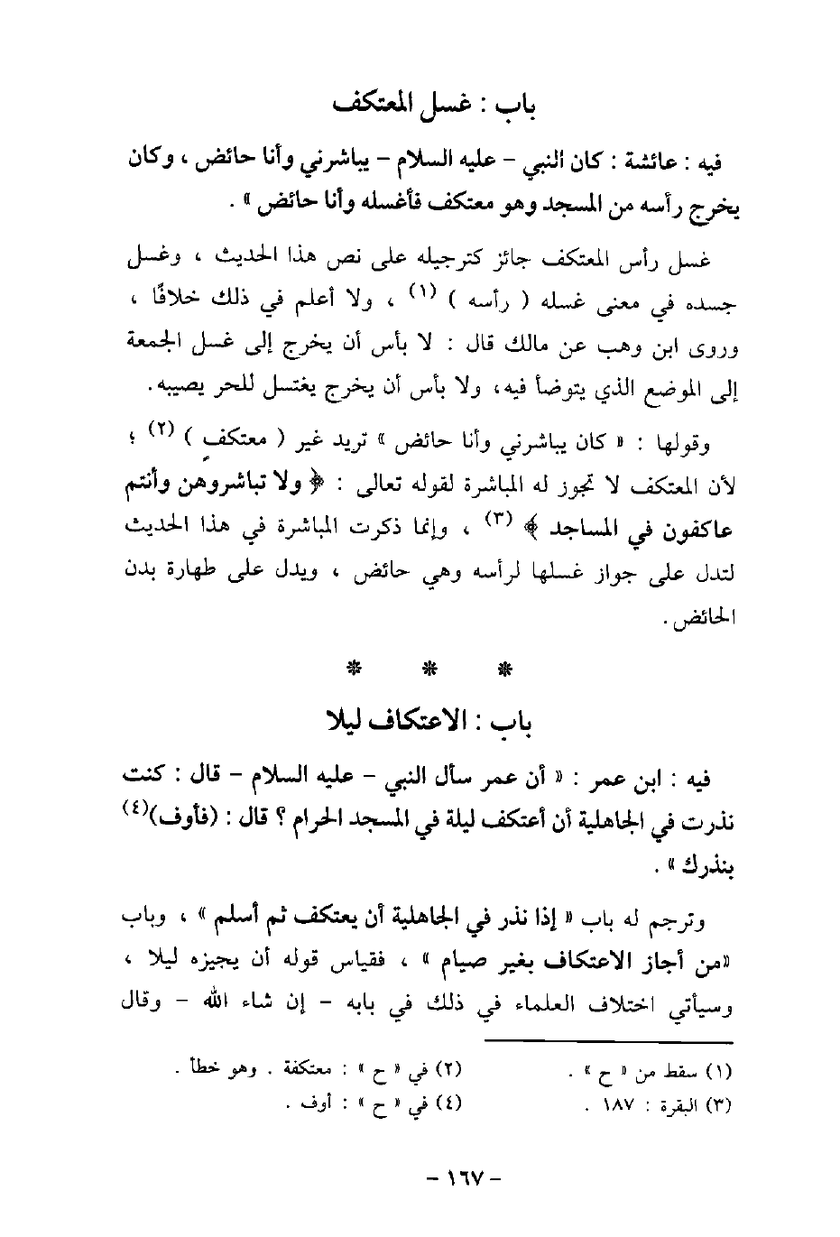 / 5 - فيه: عَائِشَةَ، كَانَ النَّبِىُّ، عليه السَّلام، يُبَاشِرُنِى، وَأَنَا حَائِضٌ، وَكَانَ يُخْرِجُ رَأْسَهُ مِنَ الْمَسْجِدِ، وَهُوَ مُعْتَكِفٌ، فَأَغْسِلُهُ وَأَنَا حَائِضٌ. غسل رأس المعتكف جائز كترجيله على نص هذا الحديث، وغسل جسده فى معنى غسله رأسه، ولا أعلم فى ذلك خلافًا، وروى ابن وهب عن مالك قال: لا بأس أن يخرج إلى غسل الجمعة إلى الموضع الذى يتوضأ فيه، ولا بأس أن يخرج يغتسل للحر يصيبه. وقولها: (كان يباشرنى وأنا حائض) تريد غير معتكفٍ؛ لأن المعتكف لا تجوز به المباشرة لقوله تعالى: (وَلا تُبَاشِرُوهُنَّ وَأَنْتُمْ عَاكِفُونَ فِى الْمَسَاجِدِ) [البقرة: 187] ، وإنما ذكرت المباشرة فى هذا الحديث لتدل على جواز غسلها لرأسه وهى حائض، ويدل على طهارة بدن الحائض.