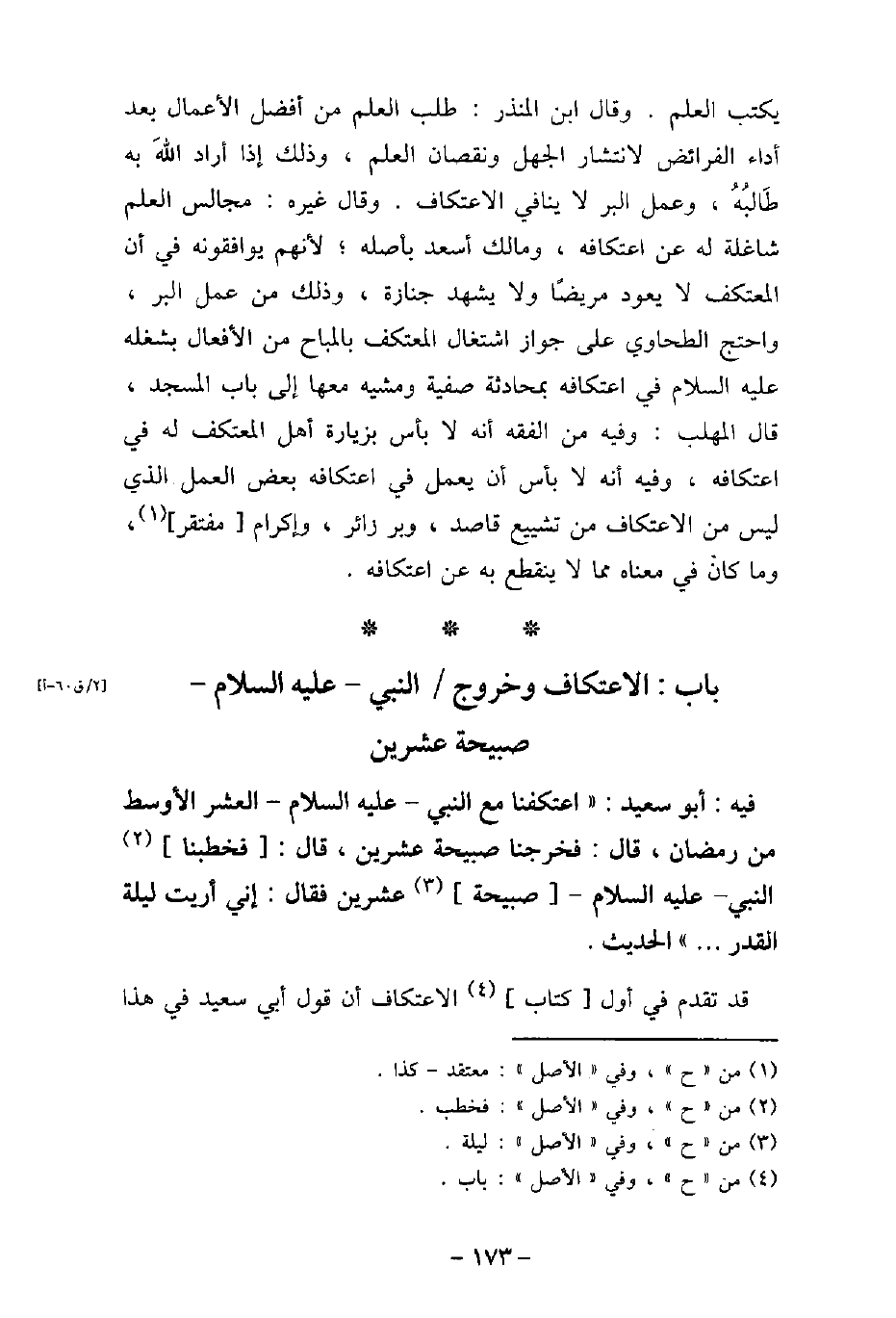 يكتب العلم. وقال ابن المنذر: طلب العلم من أفضل العمال بعد أداء الفرائض لانتشار الجهل ونقصان العلم، وذلك إذا أراد اللهَ به طَالبُهُ، وعمل البر لا ينافى الاعتكاف. وقال غيره: مجالس العلم شاغلة له عن اعتكافه، ومالك أسعد بأصله؛ لأنهم يوافقونه فى أن المعتكف لا يعود مريضًا ولا يشهد جنازة، وذلك من عمل البر، واحتج الطحاوى على جواز اشتغال المعتكف بالمباح من الأفعال بشغله عليه السلام فى اعتكافه بمحادثة صفية ومشيه معها إلى باب المسجد. قال المهلب: وفيه من الفقه أنه لا بأس بزيارة أهل المعتكف له فى اعتكافه، وفيه أنه لا بأس أن يعمل فى اعتكافه بعض العمل الذى ليس من الاعتكاف من تشييع قاصد، وبر زائر، وإكرام مفتقر، وما كان فى معناه مما لا ينقطع به عن اعتكافه.