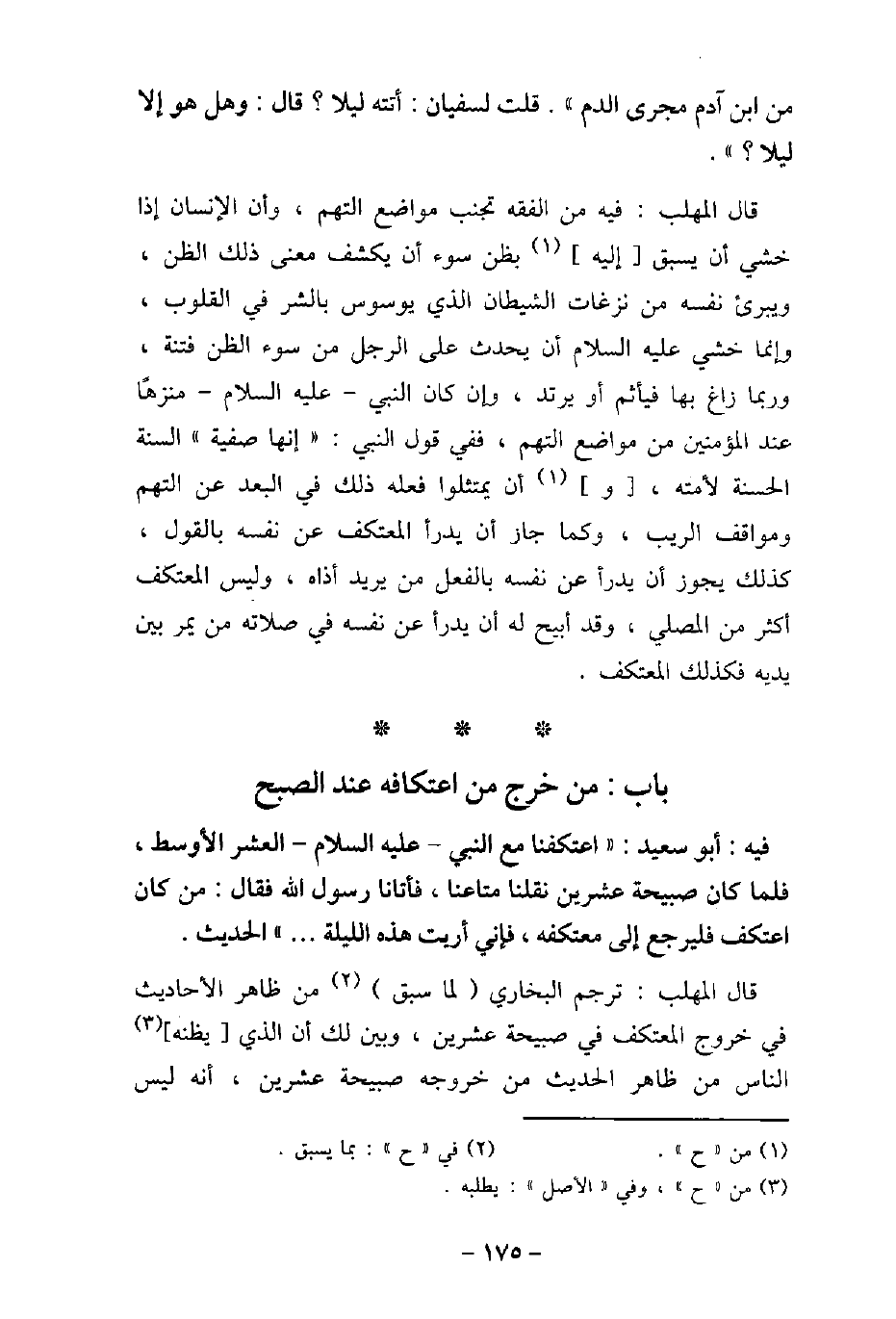 مِنِ ابْنِ آدَمَ مَجْرَى الدَّم) . قُلْتُ لِسُفْيَانَ: أَتَتْهُ لَيْلا؟ قَالَ: وَهَلْ هُوَ إِلا لَيْلٌ؟ . قال المهلب: فيه من الفقه تجنب مواضه التهم، وأن الإنسان إذا خشى أن يسبق إليه بظن سوء أن يكشف معنى ذلك الظن، ويبرئ نفسه من نزغات الشيطان الذى يوسوس بالشر فى القلوب، وإنما خشى عليه السلام أن يحدث على الرجل من سوء الظن فتنة، وربما زاغ بها فيأثم أو يرتد، وإن كان النبى عليه السلام منزهًا عند المؤمنين من مواضع التهم، ففى قول النبى (صلى الله عليه وسلم) : (إنها صفية) السنة الحسنة لأمته، أن يتمثلوا فعله ذلك فى البعد عن التهم ومواقف الريب، وكما جاز أن يدرأ المعتكف عن نفسه بالقول، كذلك يجوز أن يدرأ عن نفسه بالفعل من يريد أذاه، وليس المعتكف أكثر من المصلى، وقد أبيح له أن يدرأ عن نفسه فى صلاته من يمر بين يديه فكذلك المعتكف.