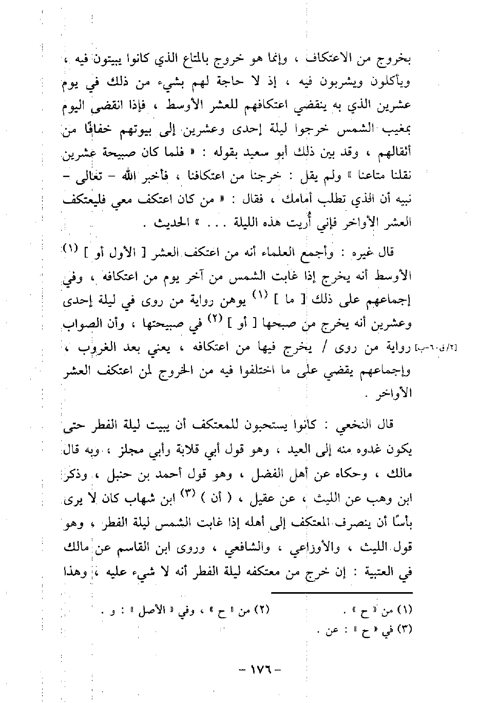 بخروج من الاعتكاف، وإنما خو خروج بالمتاع الذى كانوا يبيتون فيه، ويأكلون ويشربون فيه، إذ لا حاجة لهم بشىء من ذلك فى يوم عشرين الذى به ينقضى اعتكافهم للعشر الأوسط، فإذا انقضى اليوم بمغيب الشمس خرجوا ليلة إحدى وعشرين إلى بيوتهم خفافًا من أثقالهم، وقد بين ذلك أبو سعيد بقوله: (فلما كان صبيحة عشرين نقلنا متاعنا) ولم يقل: خرجنا من اعتكافنا، فأخبر الله تعالى نبيه أن الذى تطلب أمامك، فقال: (من كان اعتكف معى فليعتكف العشر الأواخر فإنى أُريت هذه الليلة. .) الحديث. قال غيره: وأجمع العلماء أنه من اعتكف العشر الأول أو الأوسط أنه يخرج إذا غابت الشمس من آخر يوم من اعتكافه، وفى إجماعهم على ذلك ما يوهن رواية من روى فى ليلة إحدى وعشرين أنه يخرج من صبحها أو فى صبيحتها، وأن الصواب رواية من روى يخرج فيها من اعتكافه، يعنى بعد الغروب، وإجماعهم يقضى على ما اختلفوا فيه من الخروج لمن اعتكف العشر الأواخر. قال النخعى: كانوا يستحبون للمعتكف أن يبيت ليلة الفطر حتى يكون غدوه منه إلى العيد، وهو قول أبى قلابة وأبى مجلز، وبه قال مالك، وحكاه عن أهل الفضل، وهو قول أحمد بن حنبل، وذكر ابن وهب عن الليث، عن عقيل، أن ابن شهاب كان لا يرى بأسًا أن ينصرف المعتكف إلى أهله إذا غابت الشمس ليلة الفطر، وهو قول الليث، والأوزاعى، والشافعى، وروى ابن القاسم عن مالك فى العتبية: إن خرج من معتكفه ليلة الفطر أنه لا شىء عليه، وهذا