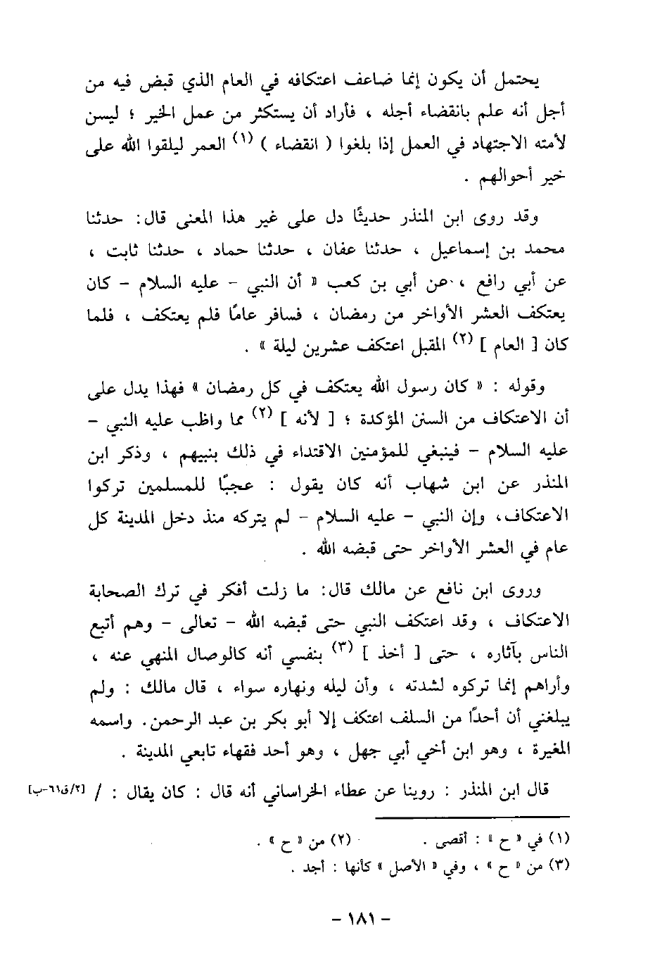 يحتمل أن يكون إنما ضاعف اعتكافه فى العام الذى قبض فيه من أجل أنه علم بانقضاء أجله، فأراد أن يستكثر من عمل الخير؛ ليسن لأمته الاجتهاد فى العمل إذا بلغوا انقضاء العمر ليلقوا الله على خير أحوالهم. وقد روى ابن المنذر حديثًا دل على غير هذا المعنى قال: حدثنا محمد بن إسماعيل، حدثنا عفان، حدثنا حماد، حدثنا ثابت، عن أبى رافع، عن أبى بن كعب (أن النبى عليه السلام كان يعتكف العشر الأواخر من رمضان، فسافر عامًا فلم يعتكف، فلما كان العام المقبل اعتكف عشرين ليلة) . وقوله: (كان رسول الله (صلى الله عليه وسلم) يعتكف فى كل رمضان) فهذا يدل على أن الاعتكاف من السنن المؤكدة؛ لأنه مما واظب عليه النبى عليه السلام فينبغى للمؤمنين الاقتداء فى ذلك بنبيهم، وذكر ابن المنذر عن ابن شهاب أنه كان يقول: عجبًا للمسلمين تركوا الاعتكاف، وإن النبى عليه السلام لم يتركه منذ دخل المدينة كل عام فى العشر الأواخر حتى قبضه الله. وروى ابن نافع عن مالك قال: ما زلت أفكر فى ترك الصحابة الاعتكاف، وقد اعتكف النبى حتى قبضه الله تعالى وهم أتبع الناس بآثاره، حتى أخذ بنفسى أنه كالوصال المنهى عنه، وأراهم إنما تركوه لشدته، وأن ليله ونهاره سواء، قال مالك: ولم يبلغنى أن أحدًا من السلف اعتكف إلا أبو بكر بن عبد الرحمن. واسمه المغيرة، وهو ابن أخى أبى جهل، وهو أحد فقهاء تابعى المدينة. قال ابن المنذر: روينا عن عطاء الخرسانى أنه قال: كان يقال: