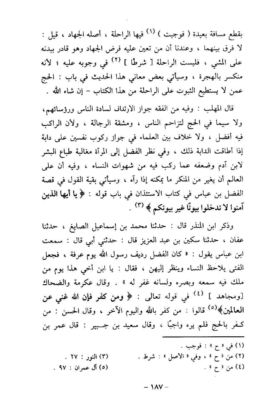 بقطع مسافة بعيدة فوجبت فيها الراحلة، أصله الجهاد، قيل: لا فرق بينهما، وعندنا أن من تعين عليه فرض الجهاد وهو قادر ببدنه على المشى، فليست الراحلة شرطًا فى وجوبه عليه؛ لأنه منكسر بالهجرة، وسيأتى بعض معانى هذا الحديث فى باب: الحج عمن لا يستطيع الثبوت على الراحلة من هذا الكتاب إن شاء الله. قال المهلب: وفيه من الفقه جواز الارتداف لسادة الناس ورؤسائهم، ولا سيما فى الحج لتزاحم الناس، ومشقة الرجالة، ولأن الراكب فيه أفضل، ولا خلاف بين العلماء فى جواز ركوب نفسين على دابة إذا أطاقت الدابة ذلك، وفى نظر الفضل إلى المرأة مغالبة طباع البشر لابن آدم وضعفه عما ركب فيه من شهوات النساء، وفيه أن على العالم أن يغير من المنكر ما يمكنه إذا رآه، وسيأتى بقية القول فى قصة الفضل بن عباس فى كتاب الاستئذان فى باب قوله: (يَا أَيُّهَا الَّذِينَ آمَنُوا لاَ تَدْخُلُوا بُيُوتًا غَيْرَ بُيُوتِكُمْ) [النور: 27] . وذكر ابن المنذر قال: حدثنا محمد بن إسماعيل الصايغ، حدثنا عفان، حدثنا سكين بن عبد العزيز قال: حدثنى أبى قال: سمعت ابن عباس يقول: (كان الفضل رديف رسول الله (صلى الله عليه وسلم) يوم عرفة، فجعل الفتى يلاحظ النساء وينظر إليهن، فقال: يا ابن أخى هذا يوم من ملك فيه سمعه وبصره ولسانه غفر له) . وقال عكرمة والضحاك ومجاهد فى قوله تعالى: (وَمَن كَفَرَ فَإِنَّ الله غَنِىٌّ عَنِ الْعَالَمِينَ) [آل عمران: 97] قالوا: من كفر بالله واليوم الآخر. وقال الحسن: من كفر بالحج فلم يره واجبًا، وقال سعيد بن جبير: قال عمر بن