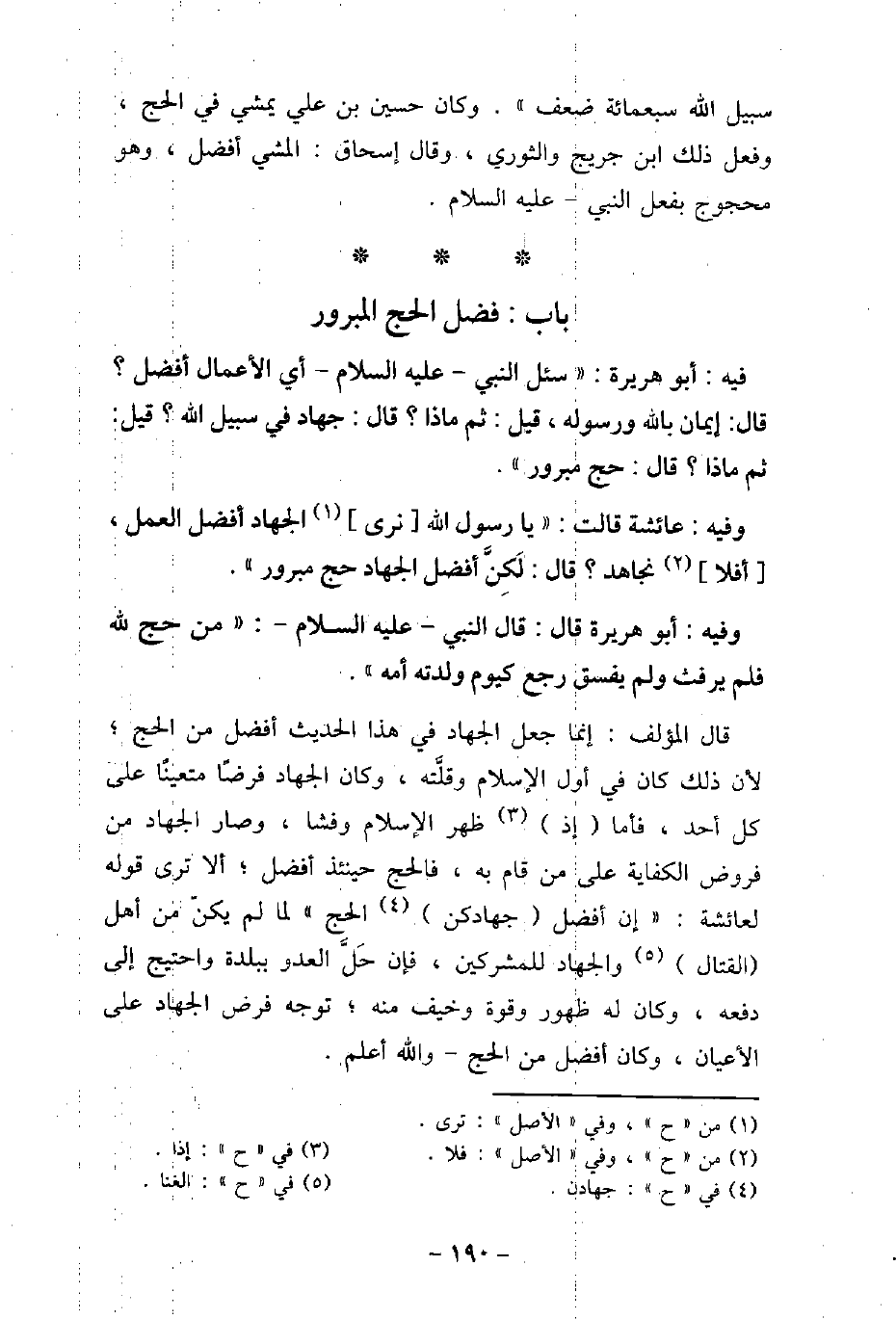 / 6 - فيه: أَبُو هُرَيْرَةَ، سُئِلَ النَّبِىُّ، عليه السَّلام، أَىُّ الأعْمَالِ أَفْضَلُ؟ قَالَ: (إِيمَانٌ بِاللَّهِ وَرَسُولِهِ) ، قِيلَ: ثُمَّ مَاذَا؟ قَالَ: (جِهَادٌ فِى سَبِيلِ اللَّهِ) ، قِيلَ: ثُمَّ مَاذَا؟ قَالَ: (حَجٌّ مَبْرُورٌ) . / 7 - وفيه: عَائِشَةَ، قَالَتْ: يَا رَسُولَ اللَّهِ، نَرَى الْجِهَادَ أَفْضَلَ الْعَمَلِ، أَفَلا نُجَاهِدُ؟ قَالَ: (لا، لَكِنَّ أَفْضَلَ الْجِهَادِ حَجٌّ مَبْرُورٌ) . / 8 - وفيه: أَبُو هُرَيْرَةَ، قَالَ النَّبِيّ، عليه السَّلام: (مَنْ حَجَّ لِلَّهِ فَلَمْ يَرْفُثْ، وَلَمْ يَفْسُقْ، رَجَعَ كَيَوْمِ وَلَدَتْهُ أُمُّهُ) . قال المؤلف: إنما جعل الجهاد فى هذا الحديث أفضل من الحج؛ لأن ذلك كان فى أول الإسلام وقلَّته، وكان الجهاد فرضًا متعينًا على كل أحد، فأما إذ ظهر الإسلام وفشا، وصار الجهاد من فروض الكفاية على من قام به، فالحج حينئذ أفضل؛ ألا ترى قوله لعائشة: (إن أفضل جهادكن الحج) لما لم يكنّ من أهل القتال والجهاد للمشركين، فإن حّلَّ العدو ببلدة واحتيج إلى دفعه، وكان له ظهور وقوة وخيف منه؛ توجه فرض الجهاد على العيان، وكان أفضل من الحج والله أعلم.
