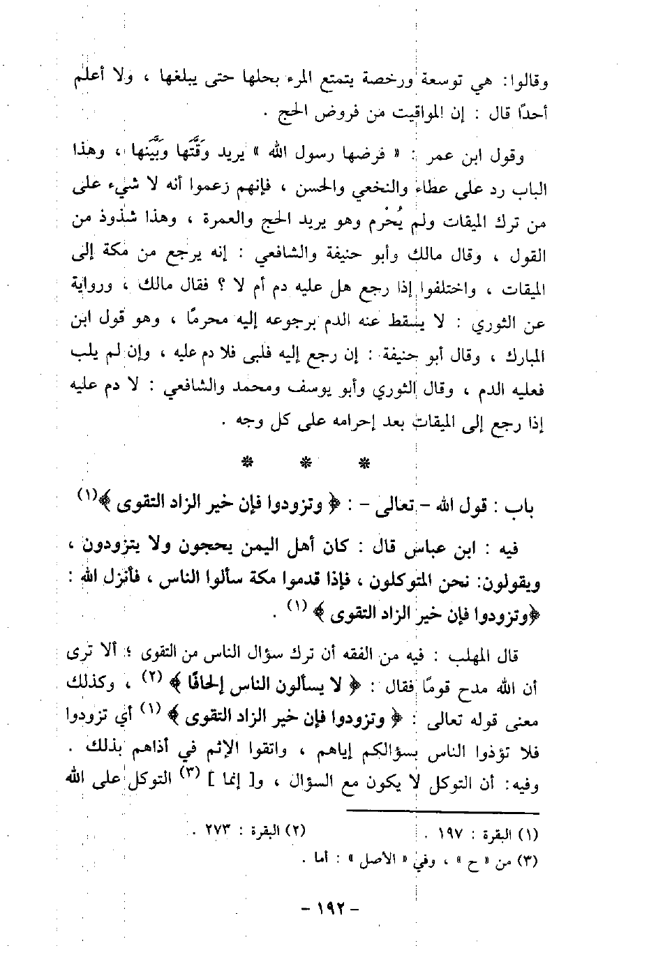 / 10 - فيه: ابْن عَبَّاس، قَالَ: كَانَ أَهْلُ الْيَمَنِ يَحُجُّونَ وَلا يَتَزَوَّدُونَ، وَيَقُولُونَ: نَحْنُ الْمُتَوَكِّلُونَ، فَإِذَا قَدِمُوا مَكَّةَ سَأَلُوا النَّاسَ، فَأَنْزَلَ اللَّهُ: (وَتَزَوَّدُوا فَإِنَّ خَيْرَ الزَّادِ التَّقْوَى (. قال المهلب: فيه من الفقه أن ترك سؤال الناس من التقوى؛ ألا ترى أن الله مدح قومًا فقال: (لاَ يَسْأَلُونَ النَّاسَ إِلْحَافًا) [البقرة: 273] ، وكذلك معنى قوله تعالى: (وَتَزَوَّدُوا فَإِنَّ خَيْرَ الزَّادِ التَّقْوَى) [البقرة: 197] أى تزودوا فلا تؤذوا الناس بسؤالكم إياهم، واتقوا الإثم فى أذاهم بذلك. وفيه: أن التوكل لا يكون مع السؤال، وإنما التوكل على الله