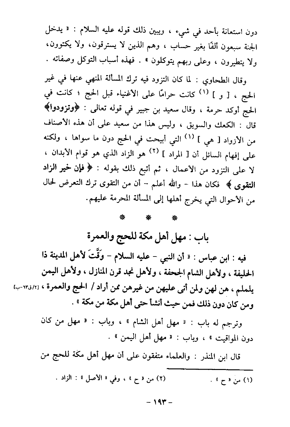 دون استعانة بأحد فى شئ، ويبين ذلك قوله عليه السلام: (يدخل الجنة سبعون ألفًا بغير حساب، وهم الذين لا يسترقون، ولا يكتتوون، ولا يتطيرون، وعلى ربهم يتوكلون) . فهذه أسباب التوكل وصفاته. وقال الطحاوى: لما كان التزود فيه ترك المسألة النهى عنها فى غير الحج، وكانت حرامًا على الأغنياء قبل الحج؛ كانت فى الحج أوكد حرمة، وقال سعيد بن جبير فى قوله تعالى: (وَتَزَوَّدُوا (قال: الكعك والسويق، وليس هذا من سعيد على أن هذه الأصناف من الأزواد هى التى أبيحت فى الحج دون ما سواها، ولكنه على إفهام السائل أن المراد هو الزاد الذى هو قوام الأبدان، لا على التزود من الأعمال، ثم أتبع ذلك بقوله: (فَإِنَّ خَيْرَ الزَّادِ التَّقْوَى (فكان هذا والله أعلم أن من التقوى ترك التعرض لحال من الأحوال التى يخرج أهلها إلى المسألة المحرمة عليهم.