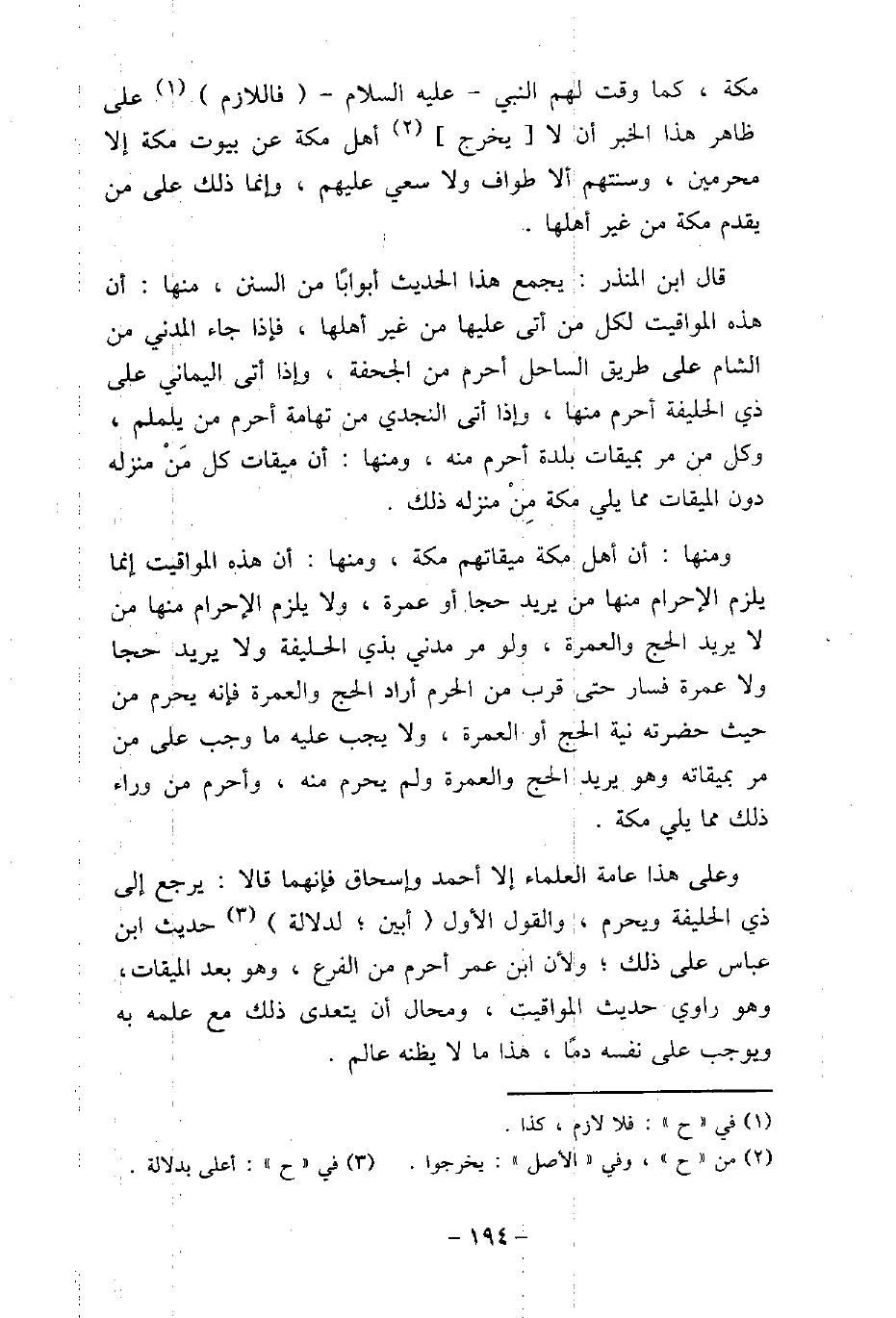 مكة، كما وقت لهم النبى عليه السلام فاللازم على ظاهر هذا الخبر أن لا يخرج أهل مكة عن بيوت مكة إلا محرمين، وسنتهم ألا طواف ولا سعى عليهم، وإنما ذلك على من يقدم مكة من غير أهلها. قال ابن المنذر: يجمع هذا الحديث أبوابًا من السنن، منها: أن هذه المواقيت لكل من أتى عليها من غير اهلها، فإذا جاء المدنى من الشام على طريق الساحل أحرم من الجحفة، وإذا أتى اليمانى على ذى الحليفة احرم منها، وإذا أتى النجدى من تهامة أحرم من يلملم، وكل من مر بميقات بلدة احرم منه، ومنها: أن ميقات كل مَنْ منزله دون الميقات مما يلى مكة مِنْ منزله ذلك. ومنها: أن أهل مكة ميقاتهم مكة، ومنها: أن هذه المواقيت إنما يلزم منها ومن يريد حجا أو عمرة، ولا يلزم الإحرام منها من لا يريد الحج والعمرة، ولو مر مدنى بذى الحليفة ولا يريد حجا ولا عمرة فسار حتى قرب من الحرم أراد الحج والعمرة فإنه يحرم من حيث حضرته نية الحج أو العمرة، ولا يجب عليه ما وجب على من مر بميقاته وهو يريد الحج والعمرة ولم يحرم منه، واحرم من وراء ذلك مما يلى مكة. وعلى هذا عامة العلماء إلا أحمد وإسحاق فإنهما قالا: يرجع إلى ذى الحليفة ويحرم، والقول الأول أبين؛ لدلالة حديث ابن عباس على ذلك؛ ولأن ابن عمر أحرم من الفرع، وهو بعد الميقات، وهو راوى حديث المواقيت، ومحال أن يتعدى ذلك مع علمه به ويوجب على نفسه دمًا، هذا ما لا يظنه عالم.