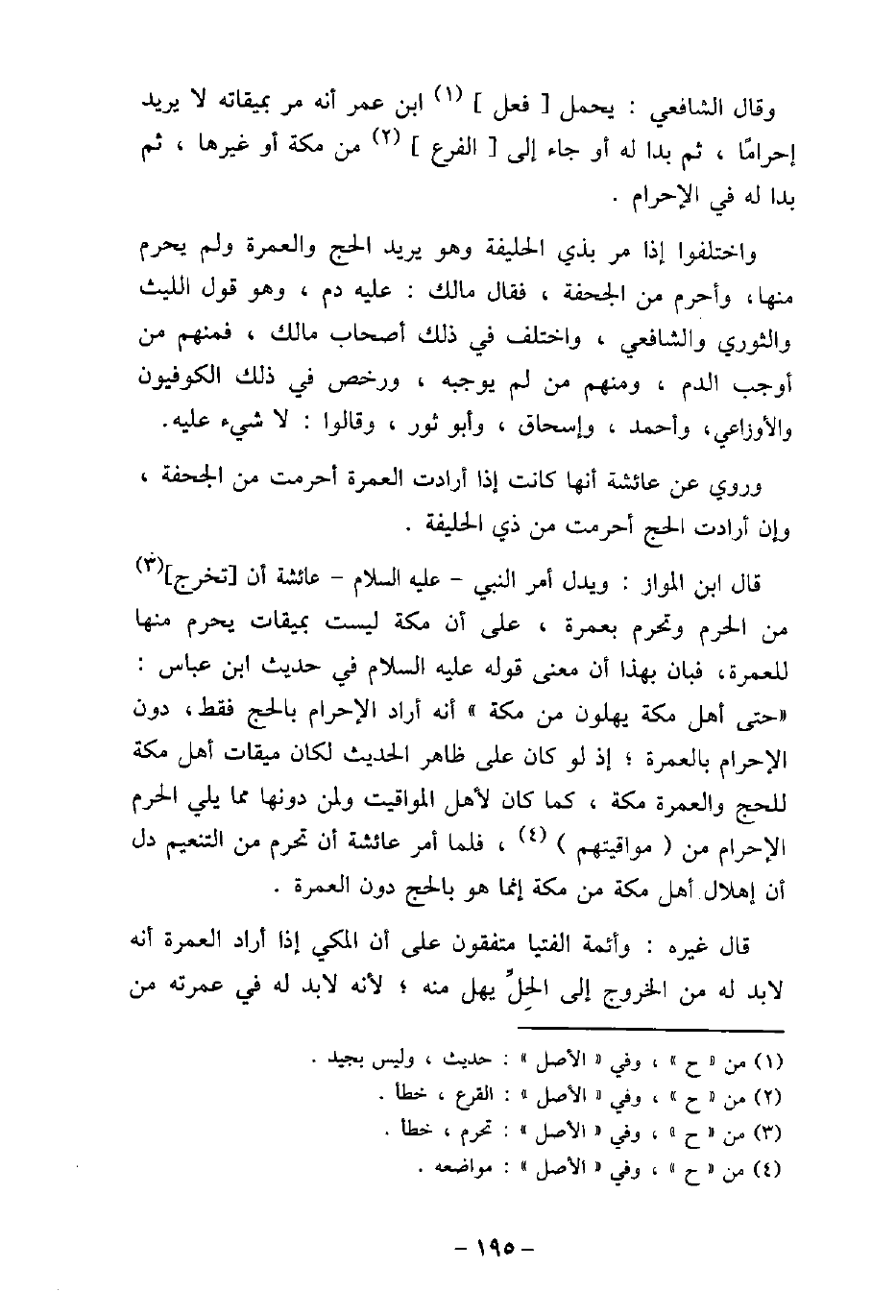 وقال الشافعى: يحمل فعل ابن عمر أنه مر بميقاته لا يريد إحرامًا، ثم بدا له أو جاء إلى الفرع من مكة أو غيرها، ثم بدا له فى الإحرام. واختلفوا إذا مر بذى الحليفة وهو يريد الحج والعمرة ولم يحرم منها، وأحرم من الجحفة، فقال مالك: عليه دم، وهو قول الليث والثورى والشافعى، واختلف فى ذلك أصحاب مالك، فمنهم من أوجب الدم، ومنهم من لم يوجبه، ورخص فى ذلك الكوفيون والأوزاعى، وأحمد، وإسحاق، وأبو ثور، وقالوا: لا شىء عليه. وروى عن عائشة انها كانت إذا أرادت العمرة أحرمت من الجحفة، وإن أرادت الحج أحرمت من ذى الحليفة. قال ابن المواز: ويدل امر النبى عليه السلام عائشة أن تخرج من الحرم وتحرم بعمرة، على أن مكة ليست بميقات يحرم منها للعمرة، فبان بهذا أن معنى قوله عليه السلام فى حديث ابن عباس: (حتى أهل مكة يهلون من مكة) أنه أراد الإحرام بالحج فقط، دون الإحرام بالعمرة؛ إذ لو كان على ظاهر الحديث لكان ميقات أهل مكة للحج والعمرة مكة، كما كان لأهل المواقيت ولمن دونها مما يلى الحرم الإحرام من مواقيتهم، فلما امر عائشة أن تحرم من التنعيم دل أن إهلال أهل مكة من مكة إنما هو بالحج دون العمرة. قال غيره: وأئمة الفتيا متفقون على أن المكى إذا أراد العمرة أنه لابد له من الخروج إلى الحِلِّ يهل منه؛ لأنه لابد له فى عمرته من