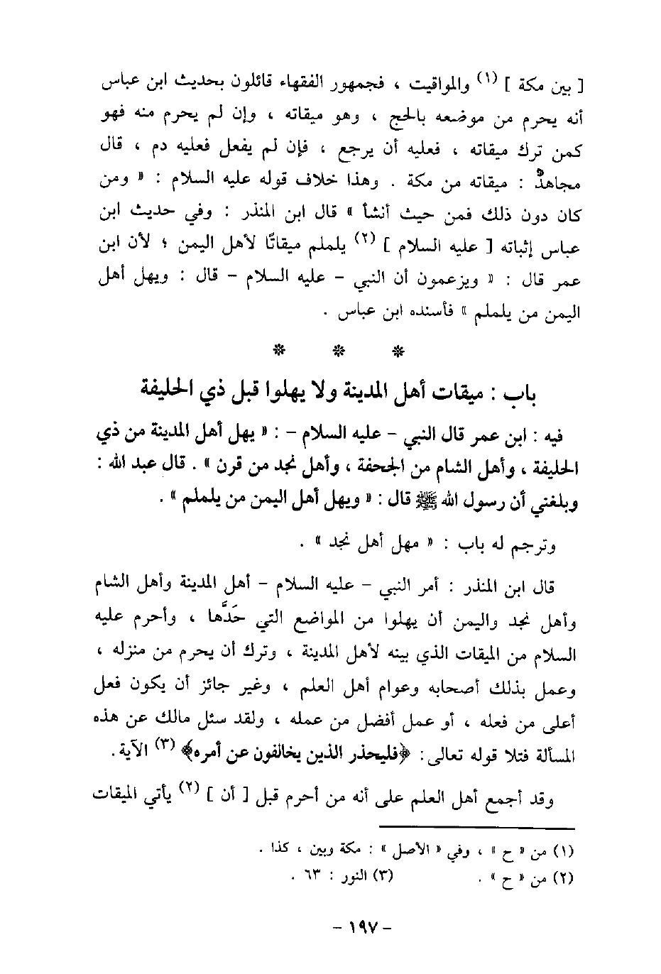 / 12 - فيه: ابْن عُمَرَ، قَالَ النَّبِىّ، عليه السَّلام: (يُهِلُّ أَهْلُ الْمَدِينَةِ مِنْ ذِى الْحُلَيْفَةِ، وَيُهِلُّ أَهْلُ الشَّأْمِ مِنَ الْجُحْفَةِ، وَأَهْلُ نَجْدٍ مِنْ قَرْنٍ) . قَالَ عَبْدُاللَّهِ: وَبَلَغَنِى أَنَّ رَسُولَ اللَّهِ (صلى الله عليه وسلم) قَالَ: (وَيُهِلُّ أَهْلُ الْيَمَنِ مِنْ يَلَمْلَمَ) . وترجم له باب: (مهل أهل نجد) . قال ابن المنذر: أمر النبى عليه السلام أهل المدينة وأهل الشام وأهل نجد واليمن أن يهلوا من المواضع التى حَدَّها، وأحرم عليه السلام من الميقات الذى بينه لأهل المدينة، وترك أن يحرم من منزله، وعمل بذلك أصحابه وعوام أهل العلم، وغير جائز أن يكون فعل أعلى من فعله، أو عمل أفضل من عمله، ولقد سئل مالك عن هذه المسألة فتلا قوله تعالى: (فَلْيَحْذَرِ الَّذِينَ يُخَالِفُونَ عَنْ أَمْرِهِ) [النور: 63] الآية. وقد أجمع أهل العلم على أنه من أحرم قبل أن يأتى الميقات