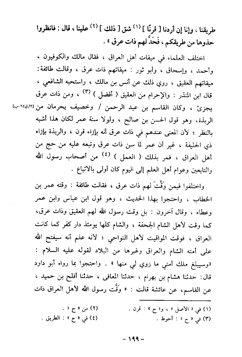 طَرِيقِنَا، وَإِنَّا إِنْ أَرَدْنَا قَرْنًا شَقَّ ذلك عَلَيْنَا، قَالَ: (فَانْظُرُوا حَذْوَهَا مِنْ طَرِيقِكُمْ، فَحَدَّ لَهُمْ ذَاتَ عِرْقٍ) . اختلف العلماء فى ميقات أهل العراق، فقال مالك والكوفيون، وأحمد، وإسحاق، وأبو ثور: ميقاتهم ذات عرق، وقالت طائفة: ميقاتهم العقيق، روى ذلك عن أنس بن مالك، واستحبه الشافعى. قال ابن المنذر: والإحرام من العقيق أفضل، ومن ذات عرق يجزئ، وكان القاسم بن عبد الرحمن، وخصيف يحرمان من الربذة، وهو قول الحسن بن صالح، ولولا سنة عمر لكان هذا أشبه بالنظر؛ لأن المعنى عندهم فى ذات عرق أنه بإزاء قرن، والربذة بإزاء ذى الحليفة، غير أن عمر لما سن ذات عرق وتبعه عليه من حج من أهل العراق، فمر بذلك العمل من أصحاب رسول الله (صلى الله عليه وسلم) والتابعين وعوام أهل العلم إلى اليوم كان أولى بالاتباع. واختلفوا فيمن وَقَّتَ لهم ذات عرق، فقالت طائفة: وقته عمر بن الخطاب، واحتجوا بهذا الحديث، وهو قول ابن عباس وابن عمر وعطاء، وقال آخرون: بل وقت رسول الله (صلى الله عليه وسلم) لهم العقيق وذات عرق، كما وقت لأهل الشام بالجحفة، والشام كلها يومئذ دار كفر كما كانت العراق، فوقت المواقيت لأهل النواحى؛ لأنه علم أنه سيفتح الله على أمته الشام والعراق وغيرها من البلاد لقوله عليه السلام: (وسيبلغ ملك أمتى ما زوى لى منها) . واحتجوا بما رواه أبو داود قال: حدثنا هشام بن بهرام، حدثنا المعافى، حدثنا أفلح بن حميد، عن القاسم، عن عائشة قالت: (وَقَّت رسول الله (صلى الله عليه وسلم) لأهل العراق ذات