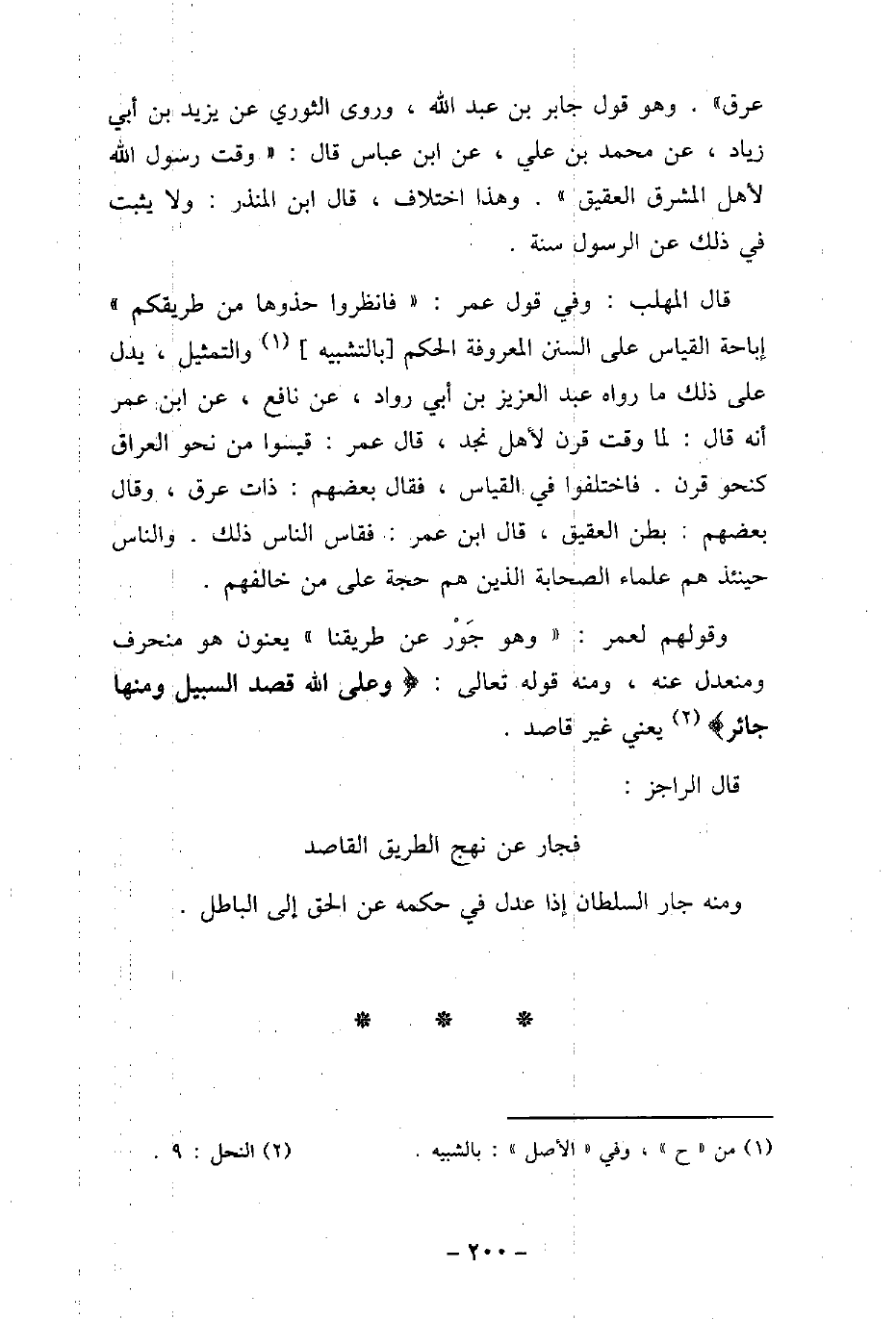 عرق) . وهو قول جابر بن عبد الله، وروى الثورى عن يزيد بن أبى زياد، عن محمد بن على، عن ابن عباس قال: (وقت رسول الله (صلى الله عليه وسلم) لأهل المشرق العقيق) . وهذا اختلاف، قال ابن المنذر: ولا يثبت فى ذلك عن الرسول سنة. قال المهلب: وفى قول عمر: (فانظروا حذوها من طريقكم) إباحة القياس على السنن المعروفة الحكم بالتشبيه والتمثيل، يدل على ذلك ما رواه عبد العزيز بن أبى رواد، عن نافع، عن ابن عمر أنه قال: لما وقت قرن لأهل نجد، قال عمر: قيسوا من نحو العراق كنحو قرن. فاختلفوا فى القياس، فقال بعضهم: ذات عرق، وقال بعضهم: بطن العقيق، قال ابن عمر: فقاس الناس ذلك. والناس حينئذ هم علماء الصحابة الذين هم حجة على من خالفهم. وقولهم لعمر: (وهو جَوْر عن طريقنا) يعنون هو منحرف ومنعدل عنه، ومنه قوله تعالى: (وَعَلَى اللهِ قَصْدُ السَّبِيلِ وَمِنْهَا جَآئِرٌ) [النحل: 9] يعنى غير قاصد. قال الراجز: فجار عن نهج الطريق القاصد ومنه جار السلطان إذا عدل فى حكمه عن الحق إلى الباطل.