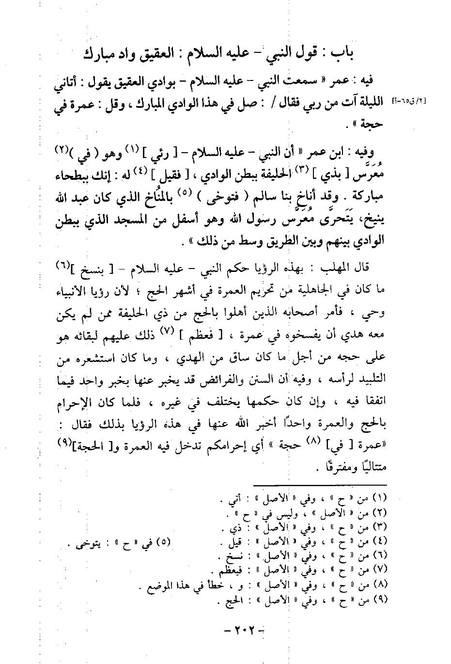 / 16 - فيه: عُمَرَ، سَمِعْتُ النَّبِىَّ، عليه السَّلام، بِوَادِى الْعَقِيقِ يَقُولُ: (أَتَانِى اللَّيْلَةَ آتٍ مِنْ رَبِّى، فَقَالَ: صَلِّ فِى هَذَا الْوَادِى الْمُبَارَكِ، وَقُلْ: عُمْرَةً فِى حَجَّةٍ) . / 17 - وفيه: ابْن عُمَرَ، أنّ النَّبِىّ، عليه السَّلام، رُئِىَ وَهُوَ فِى مُعَرَّسٍ بِذِى الْحُلَيْفَةِ بِبَطْنِ الْوَادِى، قِيلَ لَهُ: إِنَّكَ بِبَطْحَاءَ مُبَارَكَةٍ، وَقَدْ أَنَاخَ بِنَا سَالِمٌ، يَتَوَخَّى بِالْمُنَاخِ الَّذِى كَانَ عَبْدُاللَّهِ يُنِيخُ، يَتَحَرَّى مُعَرَّسَ رَسُولِ اللَّه (صلى الله عليه وسلم) وَهُوَ أَسْفَلُ مِنَ الْمَسْجِدِ الَّذِى بِبَطْنِ الْوَادِى، بَيْنَهُمْ وَبَيْنَ الطَّرِيقِ وَسَطٌ مِنْ ذَلِكَ. قال المهلب: بهذه الرؤيا حكم النبى عليه السلام بنسخ ما كان فى الجاهلية من تحريم العمرة فى أشهر الحج؛ لأن رؤيا الأنبياء وحى، فأمر أصحابه الذين أهلوا بالحج من ذى الحليفة ممن لم يكن معه هدى أن يفسخوه فى عمرة، فعظم ذلك عليهم لبقائه هو على حجه من أجل ما كان ساق من الهدى، وما كان استشعره من التلبيد لرأسه، وفيه أن السنن والفرائض قد يخبر عنها بخبر واحد فيما اتفقا فيه، وإن كان حكمها يختلف فى غيره، فلما كان الإحرام بالحج والعمرة واحدًا أخبر الله عنها فى هذه الرؤيا بذلك فقال: (عمرة فى حجة) أى إحرامكم تدخل فيه العمرة والحجة متتاليًا ومفترقًا.