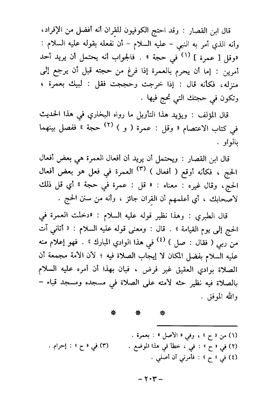 قال ابن القصار: وقد احتج الكوفيون للقِران أنه أفضل من الإفراد، وأنه الذى أمر به النبى عليه السلام أن نفعله بقوله عليه السلام: (وقل عمرة فى حجة) . فالجواب أنه يحتمل أن يريد أحد أمرين: إما أن يحرم بالعمرة إذا فرغ من حجته قبل أن يرجع إلى منزله، فكأنه قال: إذا خرجت وحججت فقل: لبيك بعمرة، وتكون فى حجتك التى تحج فيها. قال المؤلف: ويؤيد هذا التأويل ما رواه البخارى فى هذا الحديث فى كتاب الاعتصام (وقل: عمرة وحجة) ففصل بينهما بالواو. قال ابن القصار: ويحتمل أن يريد أن أفعال العمرة هى بعض أفعال الحج، فكأنه أوقع أفعال العمرة فى فعل هو بعض أفعال الحج، وقال غيره: معناه: (قل: عمرة فى حجة) أى قل ذلك لأصحابك، أى أعلمهم أن القِران جائز، وأنه من سنن الحج. قال الطبرى: وهذا نظير قوله عليه السلام: (دخلت العمرة فى الحج إلى يوم القيامة) . قال: ومعنى قوله عليه السلام: (أتانى آت من ربى فقال: صل فى هذا الوادى المبارك) . فهو إعلام منه عليه السلام بفضل المكان لا إيجاب الصلاة فيه؛ لأن الأمة مجمعة أن الصلاة بوادى العقيق غير فرض، فبان بهذا أن أمره عليه السلام بالصلاة فيه نظير حثه لأمته على الصلاة فى مسجده ومسجد قباء والله الموفق.