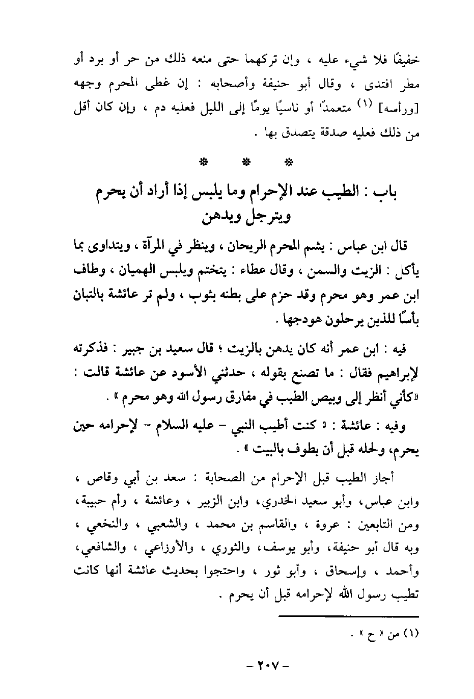 قَالَ ابْنُ عَبَّاسٍ: يَشَمُّ الْمُحْرِمُ الرَّيْحَانَ، وَيَنْظُرُ فِى الْمِرْآةِ، وَيَتَدَاوَى بِمَا يَأْكُلُ الزَّيْتِ وَالسَّمْنِ. وَقَالَ عَطَاءٌ: يَتَخَتَّمُ وَيَلْبَسُ الْهِمْيَانَ. وَطَافَ ابْنُ عُمَرَ وَهُوَ مُحْرِمٌ وَقَدْ حَزَمَ عَلَى بَطْنِهِ بِثَوْبٍ، وَلَمْ تَرَ عَائِشَةُ بِالتُّبَّانِ بَأْسًا لِلَّذِينَ يَرْحَلُونَ هَوْدَجَهَا. / 19 - فيه: ابْن عُمَرَ، أنَّهُ كَانَ يَدَّهِنُ بِالزَّيْتِ، قَالَ سعيد بن جبير: فَذَكَرْتُهُ لإبْرَاهِيمَ، فقَالَ: مَا تَصْنَعُ بِقَوْلِهِ: حَدَّثَنِى الأسْوَدُ عَنْ عَائِشَةَ، قَالَتْ: كَأَنِّى أَنْظُرُ إِلَى وَبِيصِ الطِّيبِ فِى مَفَارِقِ رَسُولِ اللَّهِ (صلى الله عليه وسلم) وَهُوَ مُحْرِمٌ. / 20 - فيه: عَائِشَةَ، كُنْتُ أُطَيِّبُ رَسُولَ اللَّهِ (صلى الله عليه وسلم) لإحْرَامِهِ حِينَ يُحْرِمُ، وَلِحِلِّهِ قَبْلَ أَنْ يَطُوفَ بِالْبَيْتِ. أجاز الطيب قبل الإحرام من الصحابة: سعد بن أبى وقاص، وابن عباس، وأبو سعيد الخدرى، وابن الزبير، وعائشة، وأم حبيبة، ومن التابعين: عروة، والقاسم بن محمد، والشعبى، والنخعى، وبه قال أبو حنيفة، وأبو يوسف، والثورى، والأوزاعى، والشافعى، وأحمد، وإسحاق، وأبو ثور، واحتجوا بحديث عائشة أنها كانت تطيب رسول الله (صلى الله عليه وسلم) لإحرامه قبل أن يحرم.