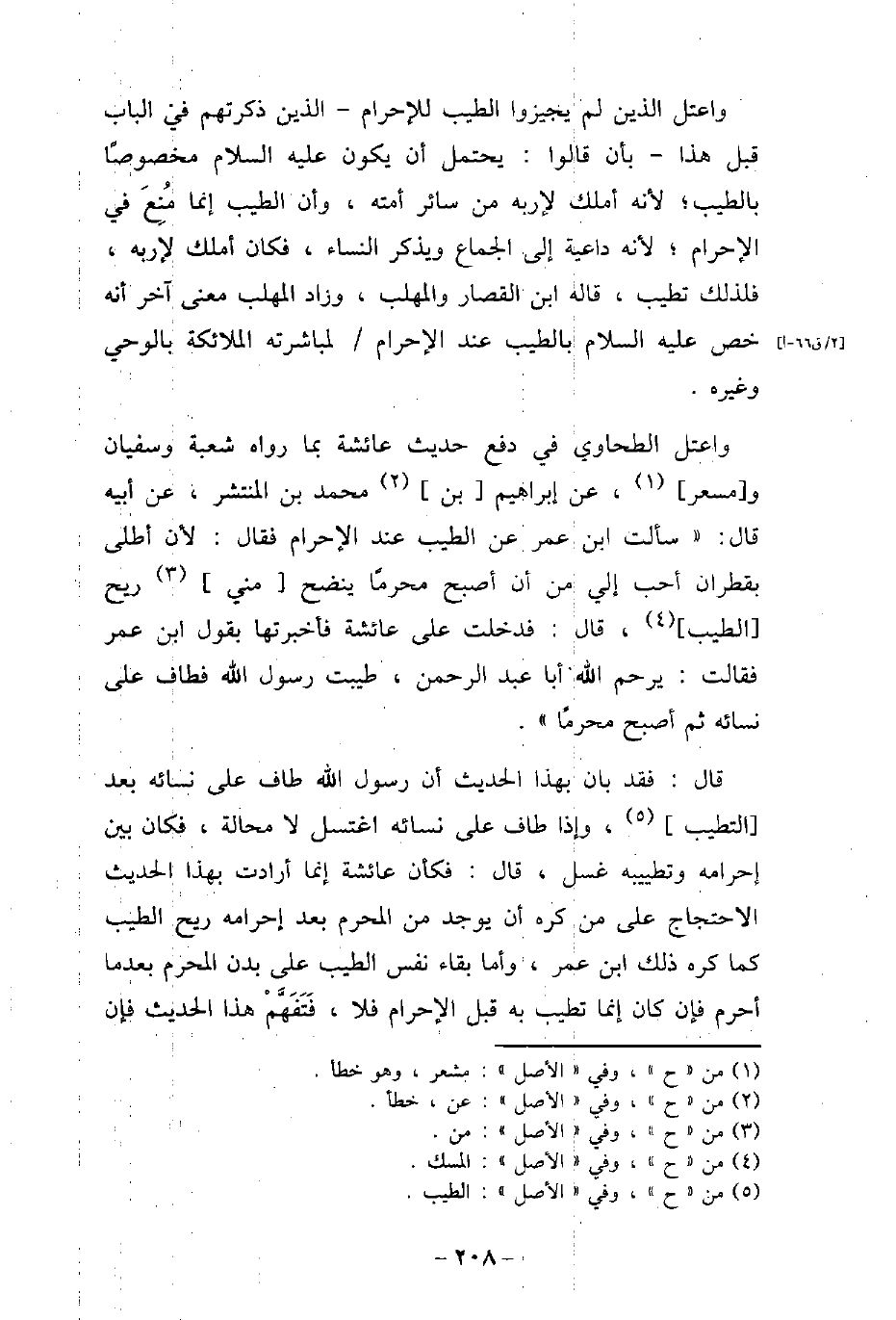 واعتل الذين لم يجيزوا الطيب للإحرام، الذين ذكرتهم فى الباب قبل هذا، بأن قالوا: يحتمل أن يكون عليه السلام مخصوصًا بالطيب؛ لأنه أملك لإربه من سائر أمته، وأن الطيب إنما مُنِعَ فى الإحرام؛ لأنه داعية إلى الجماع ويذكر النساء، فكان أملك لإربه، فلذلك تطيب، قاله ابن القصار والمهلب، وزاد المهلب معنى آخر أنه خص عليه السلام بالطيب عند الإحرام لمباشرته الملائكة بالوحى وغيره. واعتل الطحاوى فى دفع حديث عائشة بما رواه شعبة وسفيان ومسعر، عن إبراهيم بن محمد بن المنتشر، عن أبيه قال: (سألت ابن عمر عن الطيب عند الإحرام فقال: لأن أطلى بقطران أحب إلى من أن أصبح محرمًا ينضح منى ريح الطيب، قال: فدخلت على عائشة فأخبرتها بقول ابن عمر فقالت: يرحم الله أبا عبد الرحمن، طيبت رسول الله (صلى الله عليه وسلم) فطاف على نسائه ثم أصبح محرمًا) . قال: فقد بان بهذا الحديث أن رسول الله (صلى الله عليه وسلم) طاف على نسائه بعد التطيب، وإذا طاف على نسائه اغتسل لا محالة، فكان بين إحرامه وتطييبه غسل، قال: فكأن عائشة إنما أرادت بهذا الحديث الاحتجاج على من كره أن يوجد من المحرم بعد إحرامه ريح الطيب كما كره ذلك ابن عمر، وأما بقاء نفس الطيب على بدن المحرم بعدما أحرم فإن كان إنما تطيب به قبل الإحرام فلا، فَتَفَهَّمْ هذا الحديث فإن